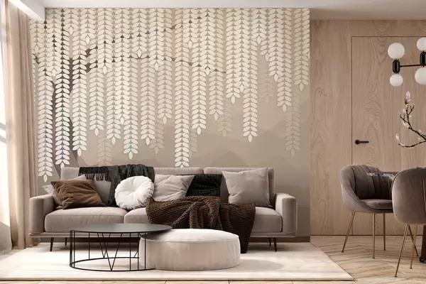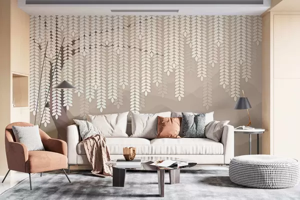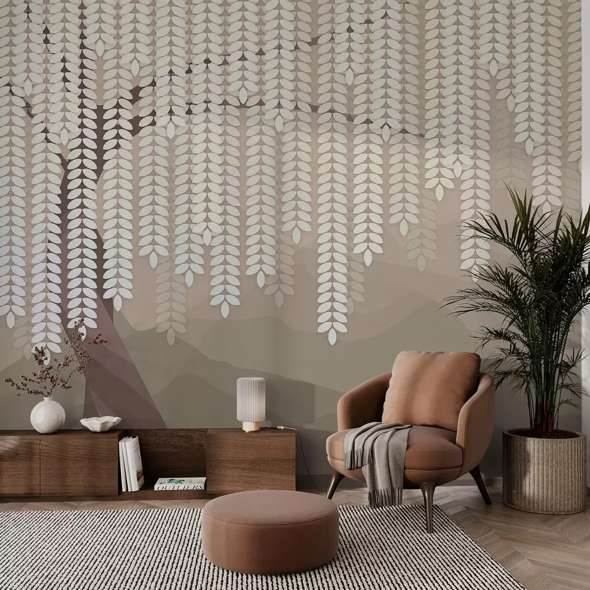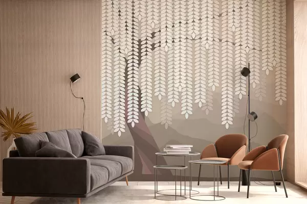 Fototapeta stylizowana wierzba z wiszącymi liśćmi na tle minimalistycznych gór w odcieniach kawy Nr w05232v2
