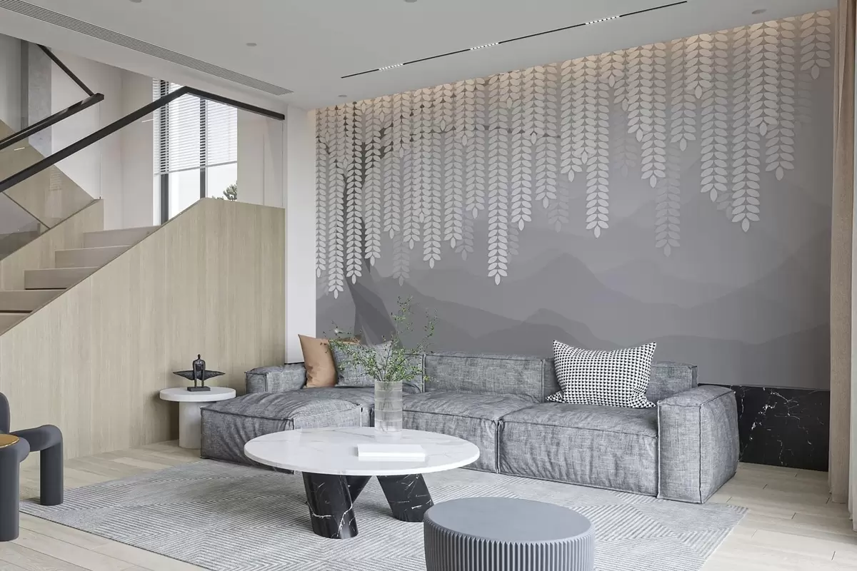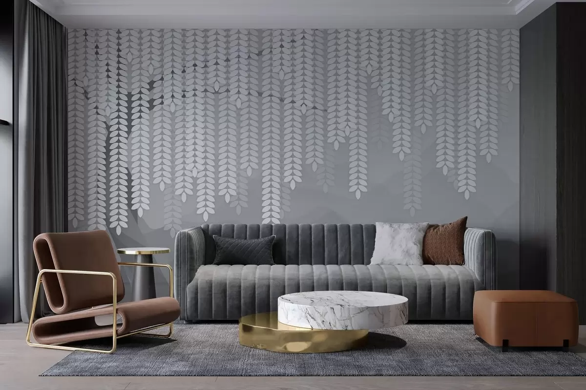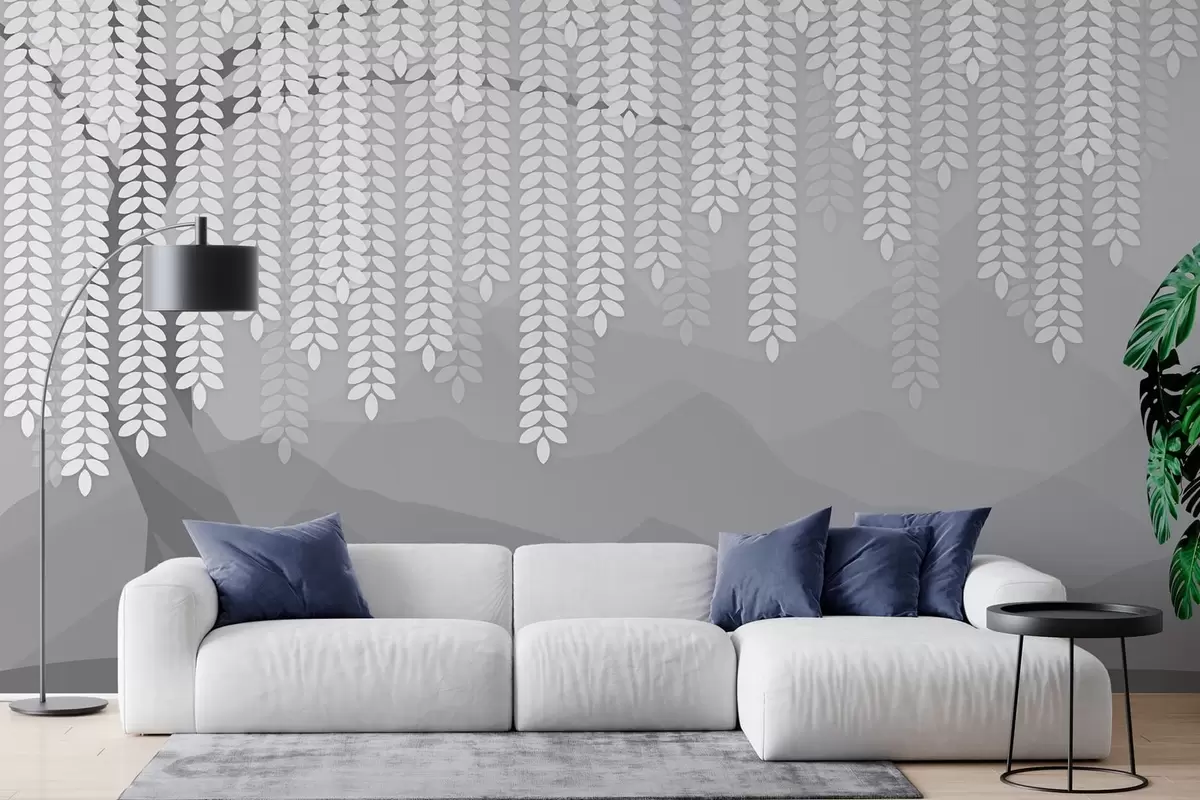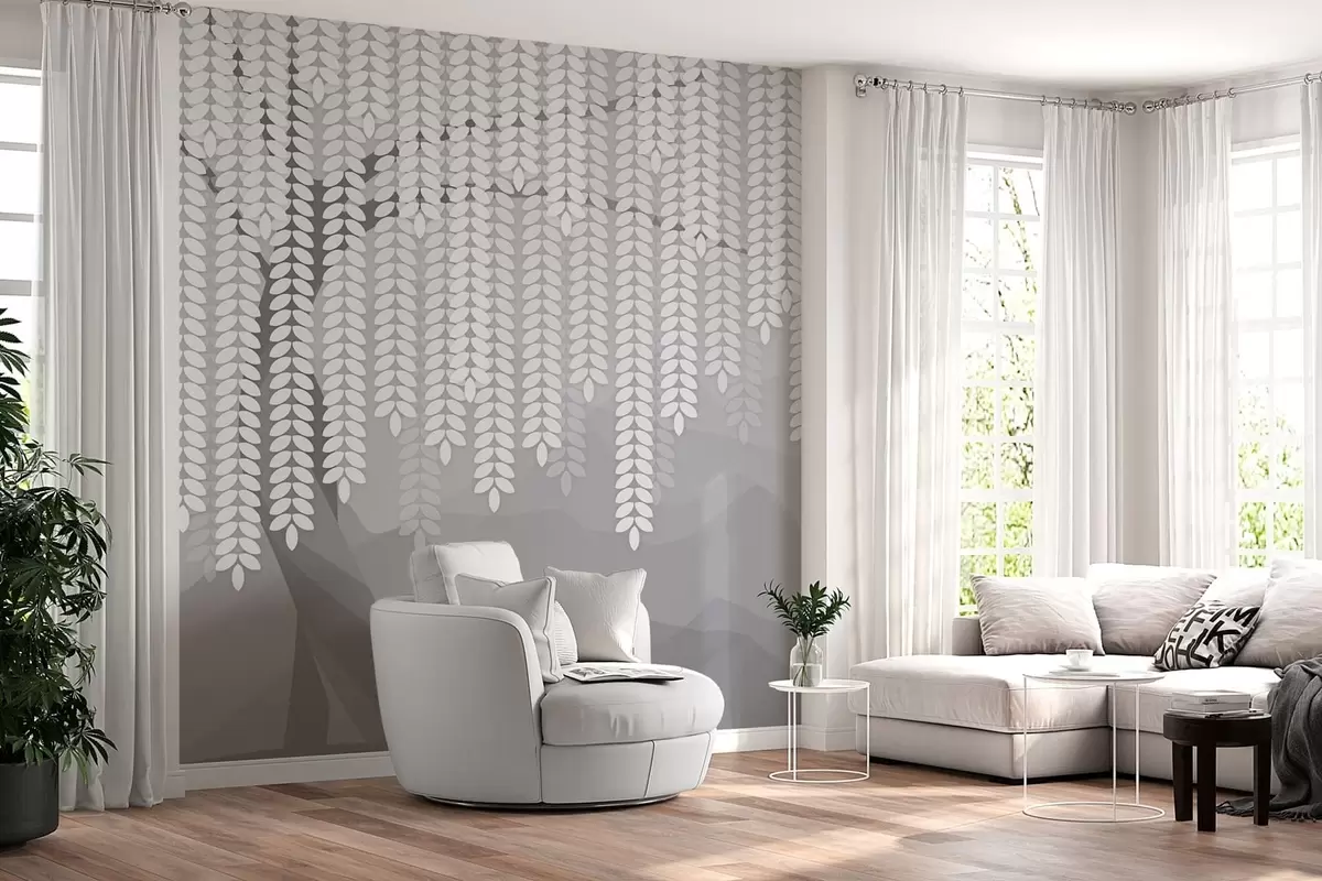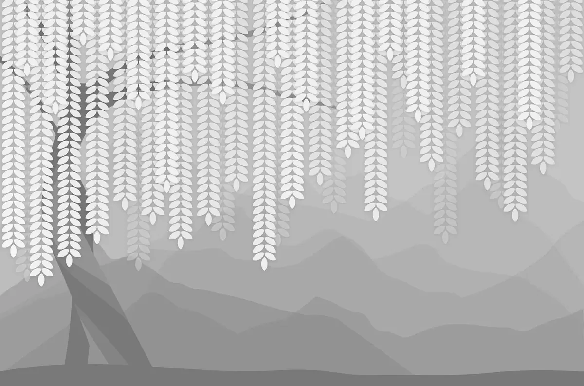 Fototapeta stylizowana wierzba z wiszącymi liśćmi na tle minimalistycznych gór w odcieniach szarości Nr w05232v3