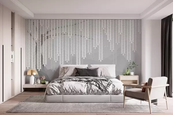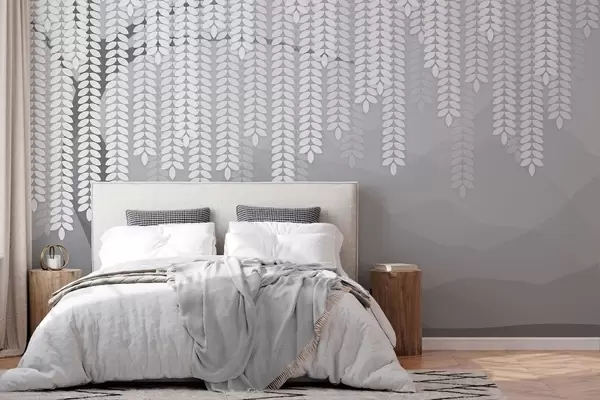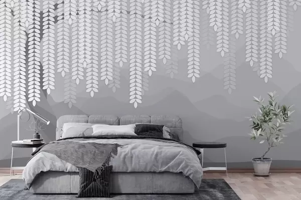 Fototapeta stylizowana wierzba z wiszącymi liśćmi na tle minimalistycznych gór w odcieniach szarości Nr w05232v3