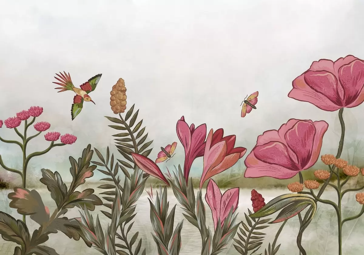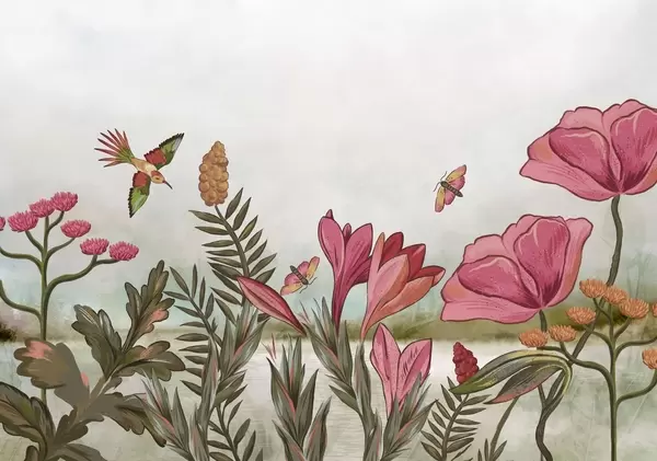 Fototapeta Jasne kwiaty z ptakami i motylami Nr w05321