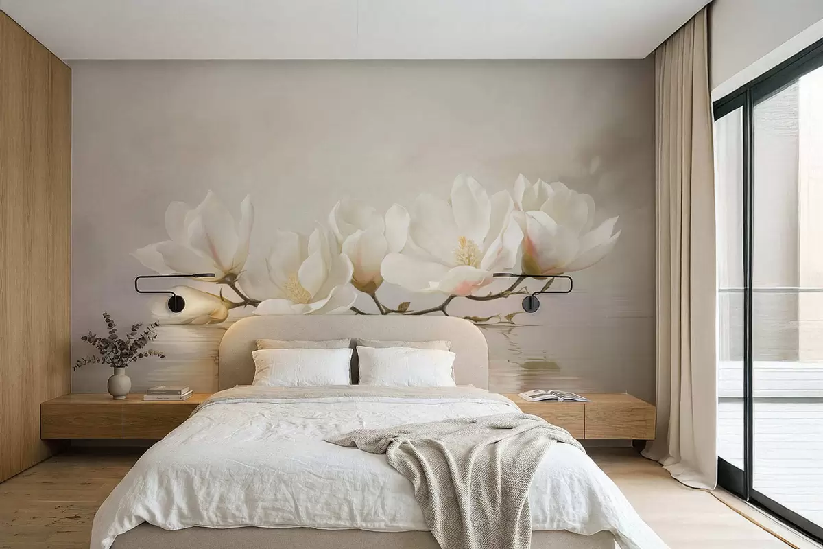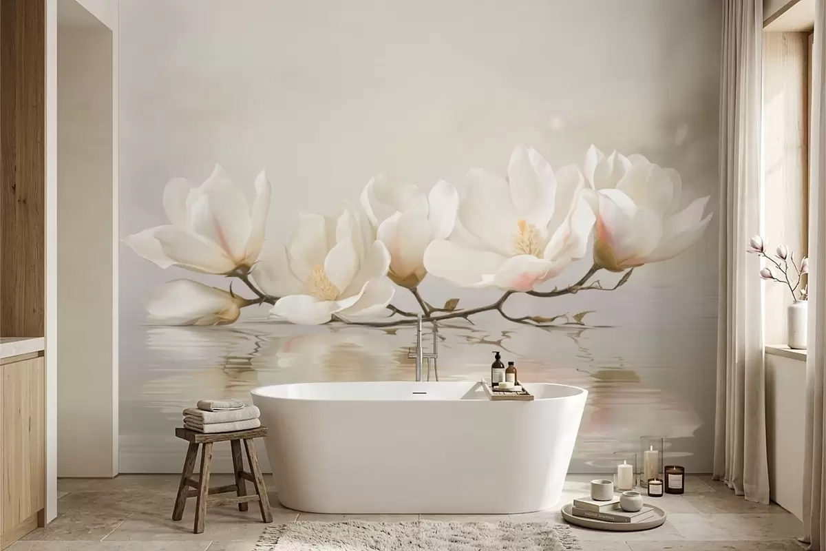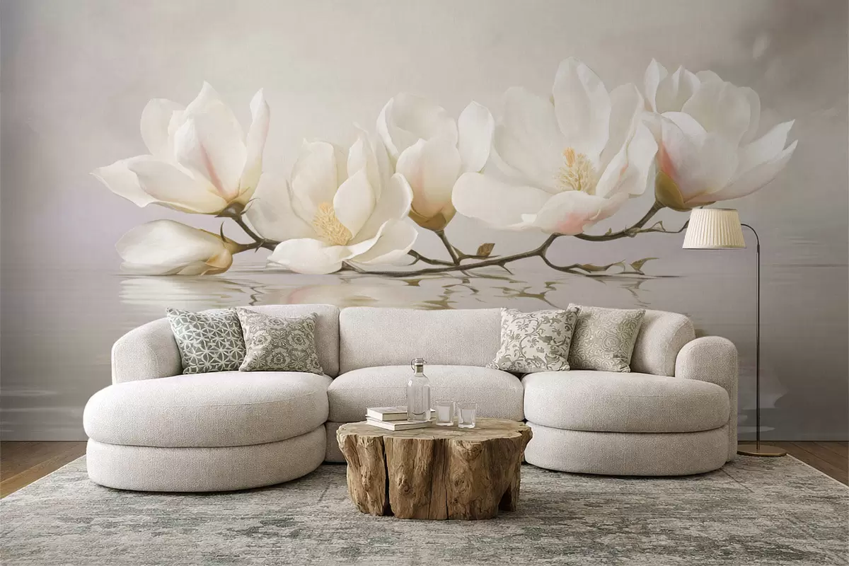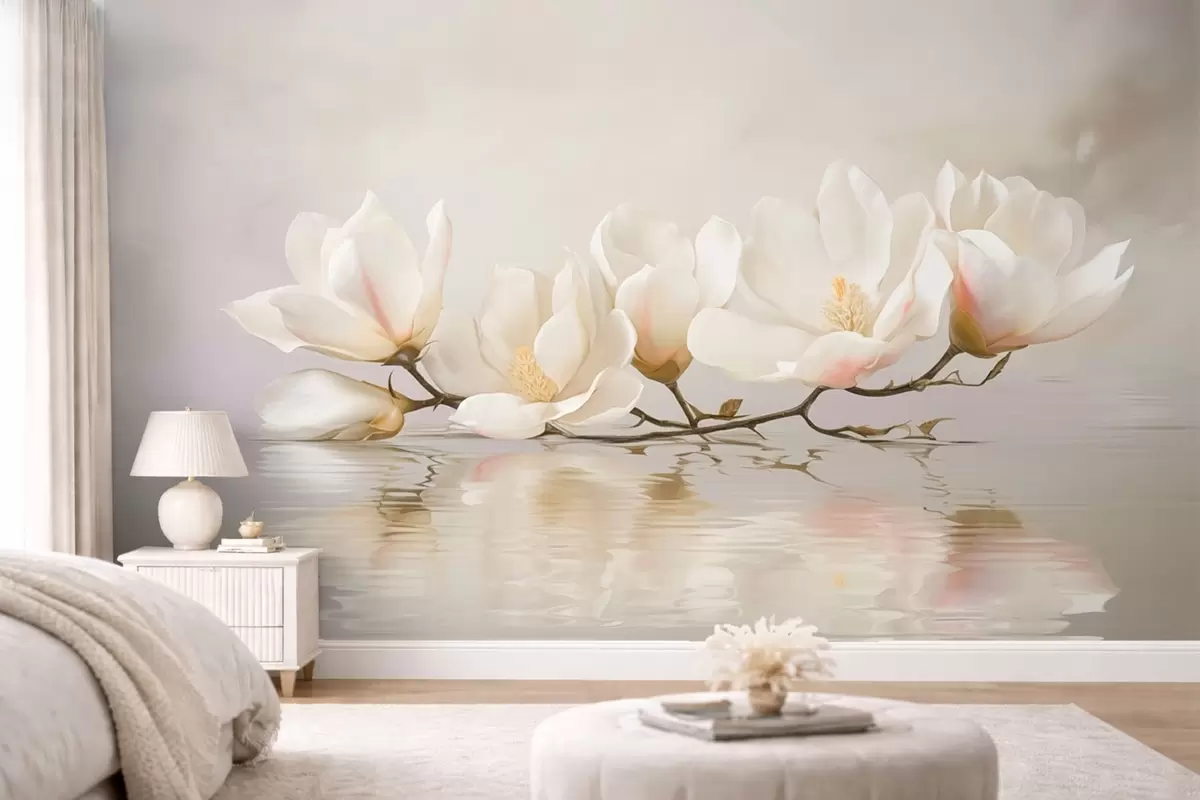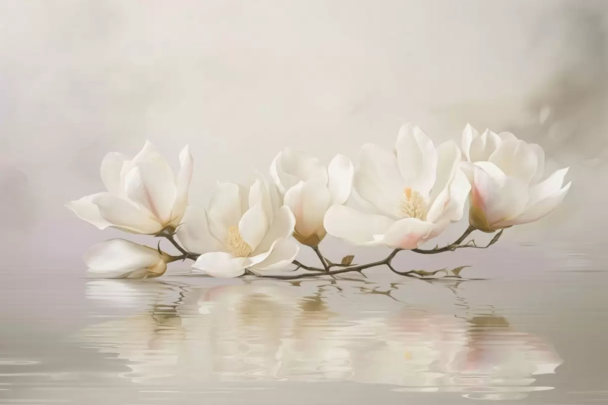 Fototapeta Jasne kwiaty magnolii na gałęzi nad odbiciem w wodzie Nr w05353