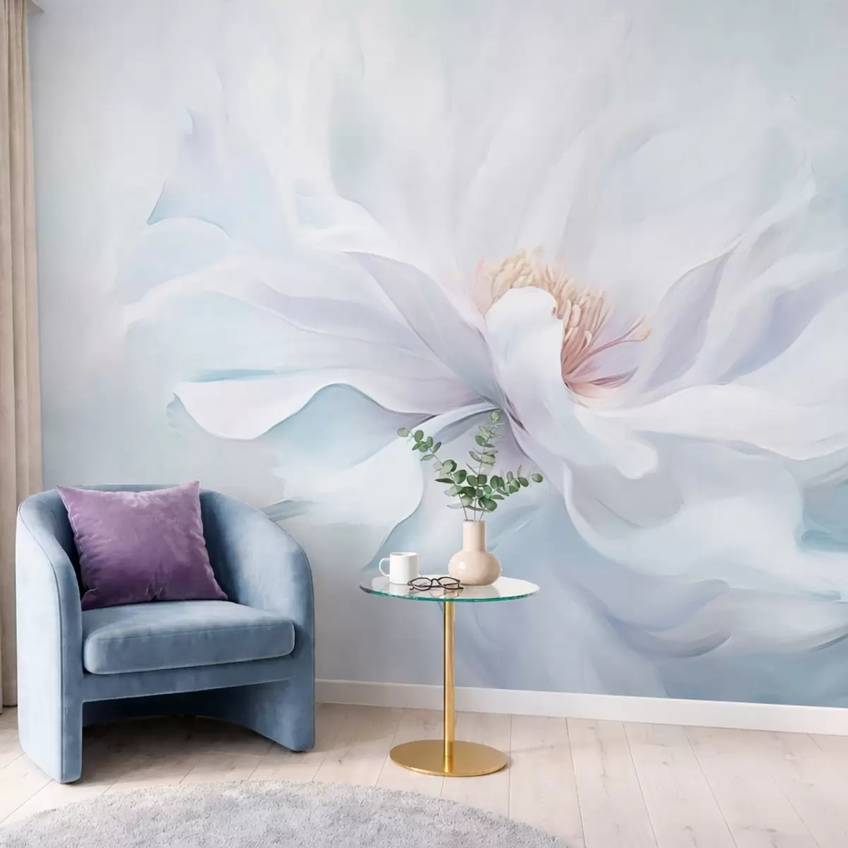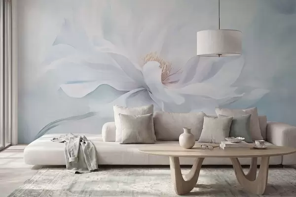 Fototapeta Delikatny biały kwiat z płynnymi płatkami na niebieskim tle Nr w05354
