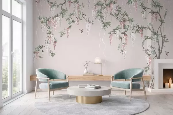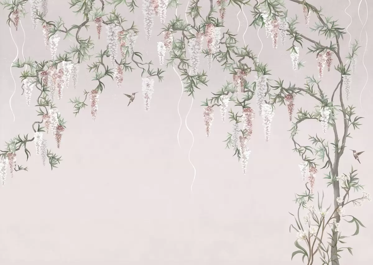 Fototapeta Kwitnące gałęzie z różowymi kwiatami i ptakami Nr w05394v1