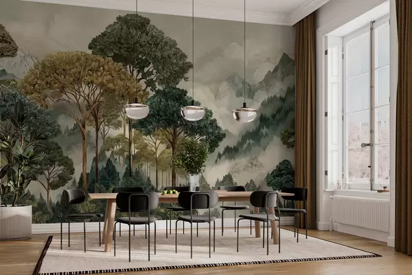 Fototapeta Las z wysokimi drzewami w zamglonych górach Nr w05410