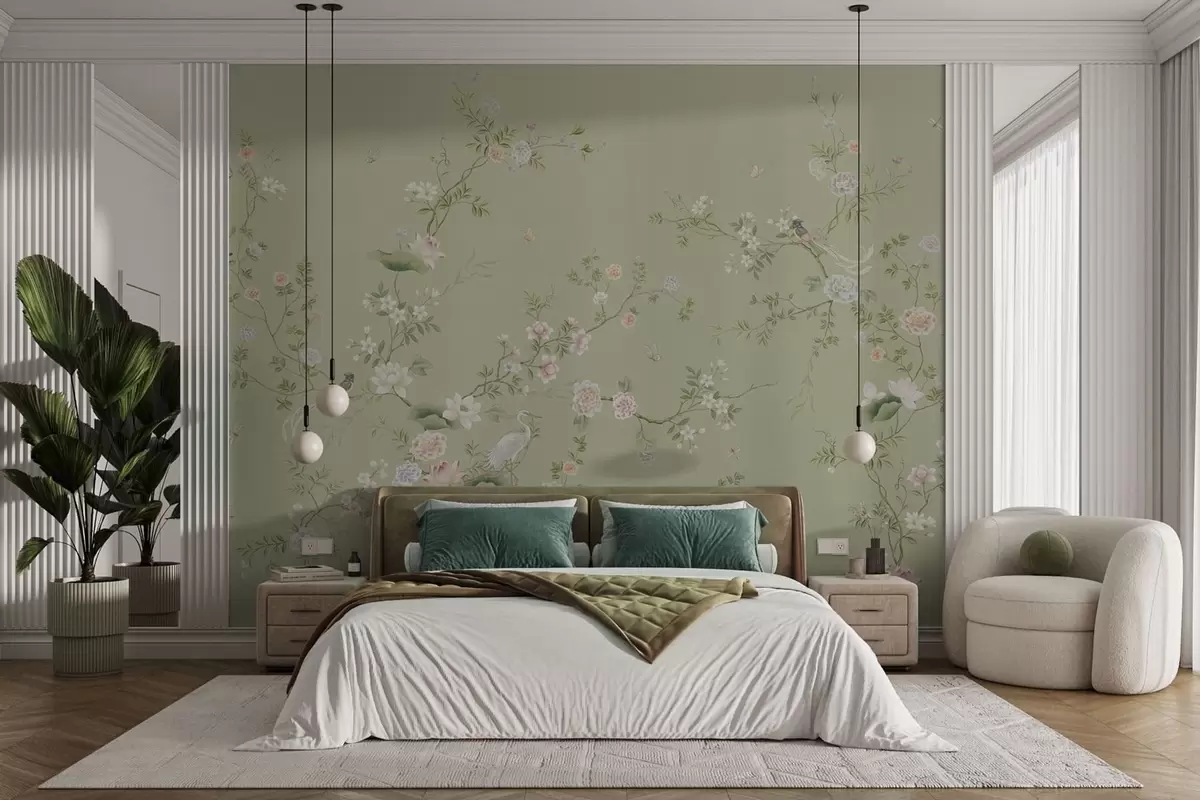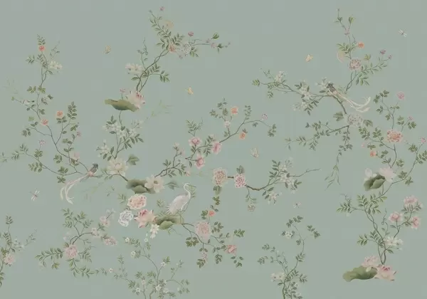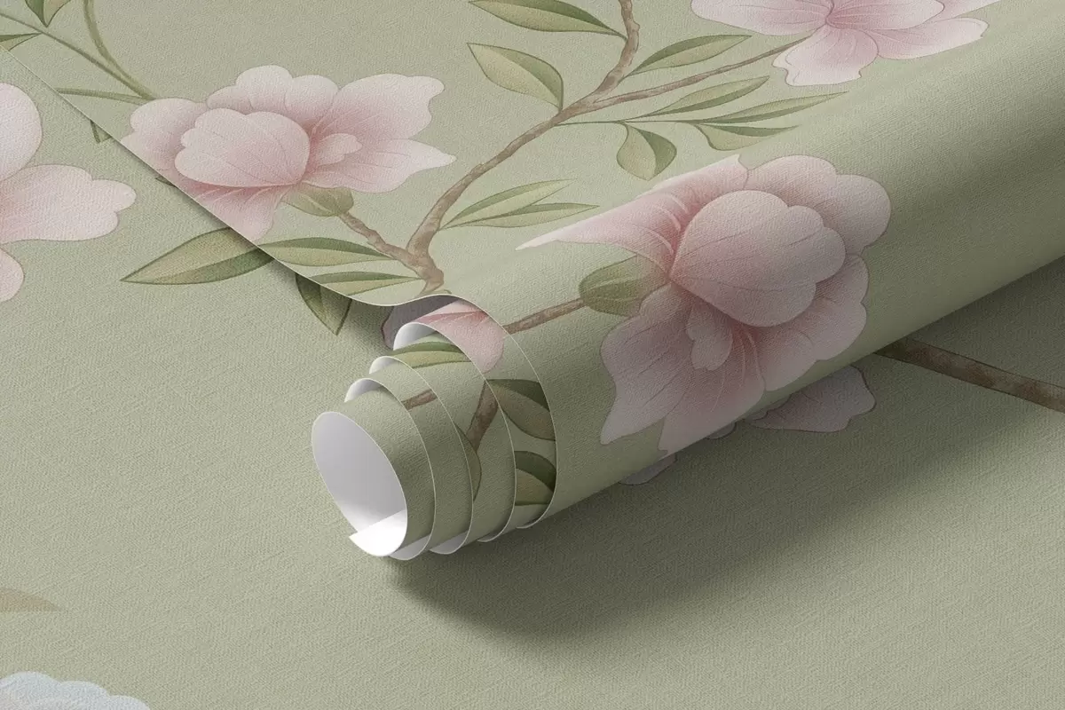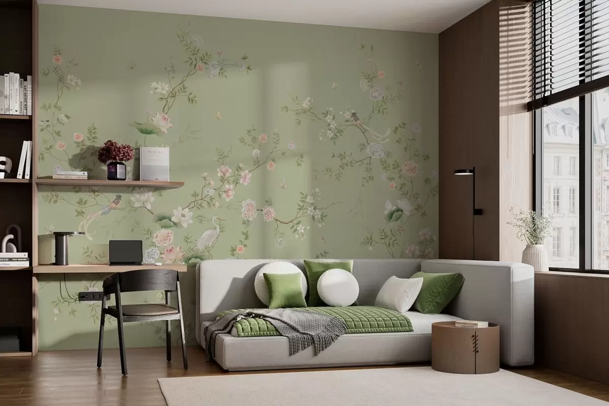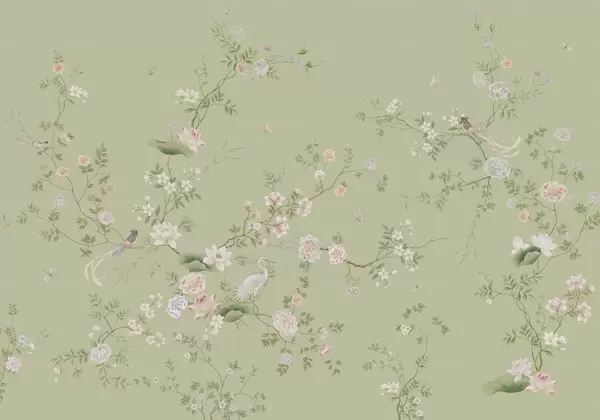 Fototapeta Kwitnące gałęzie z ptakami na jasnozielonym tle Nr w05416