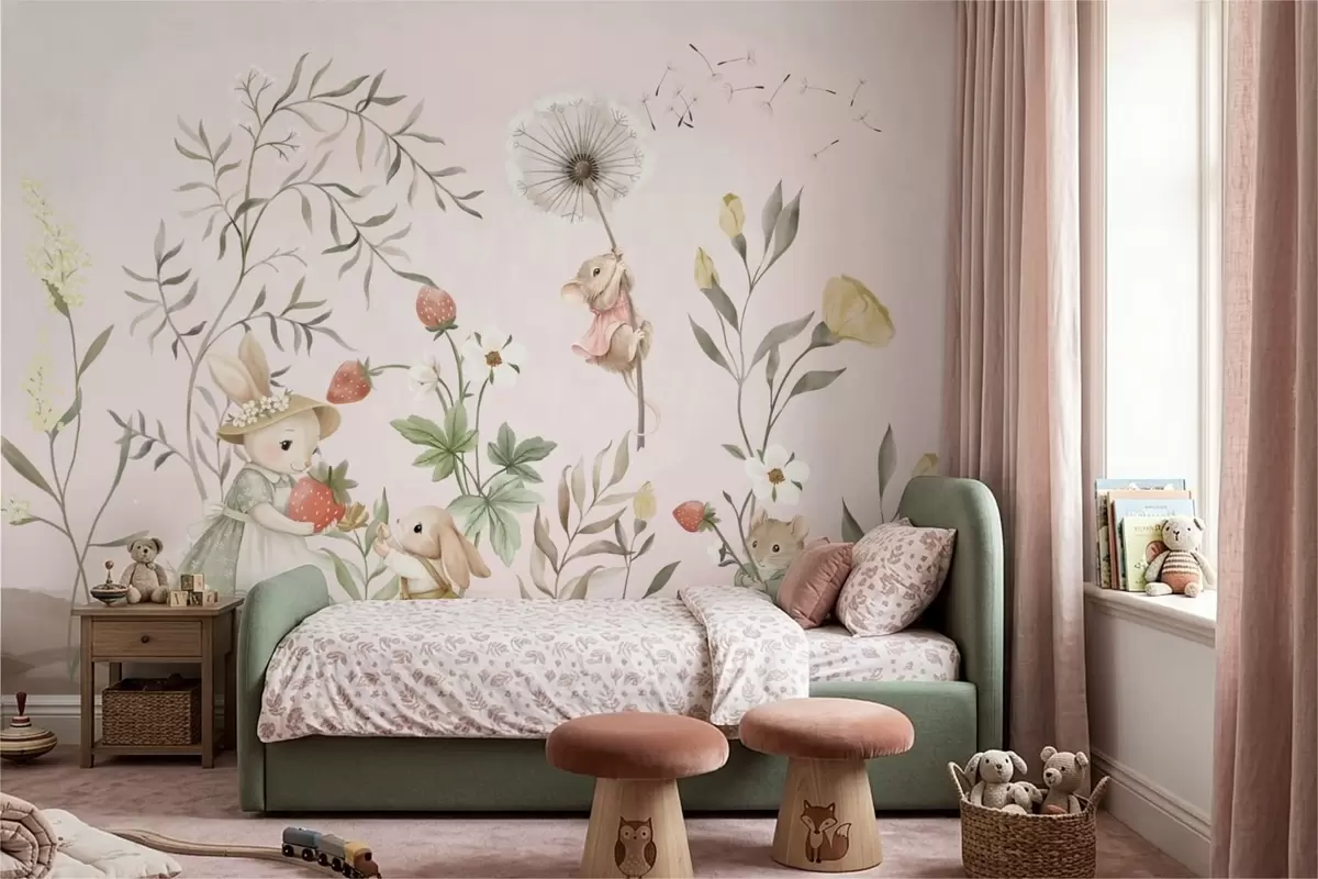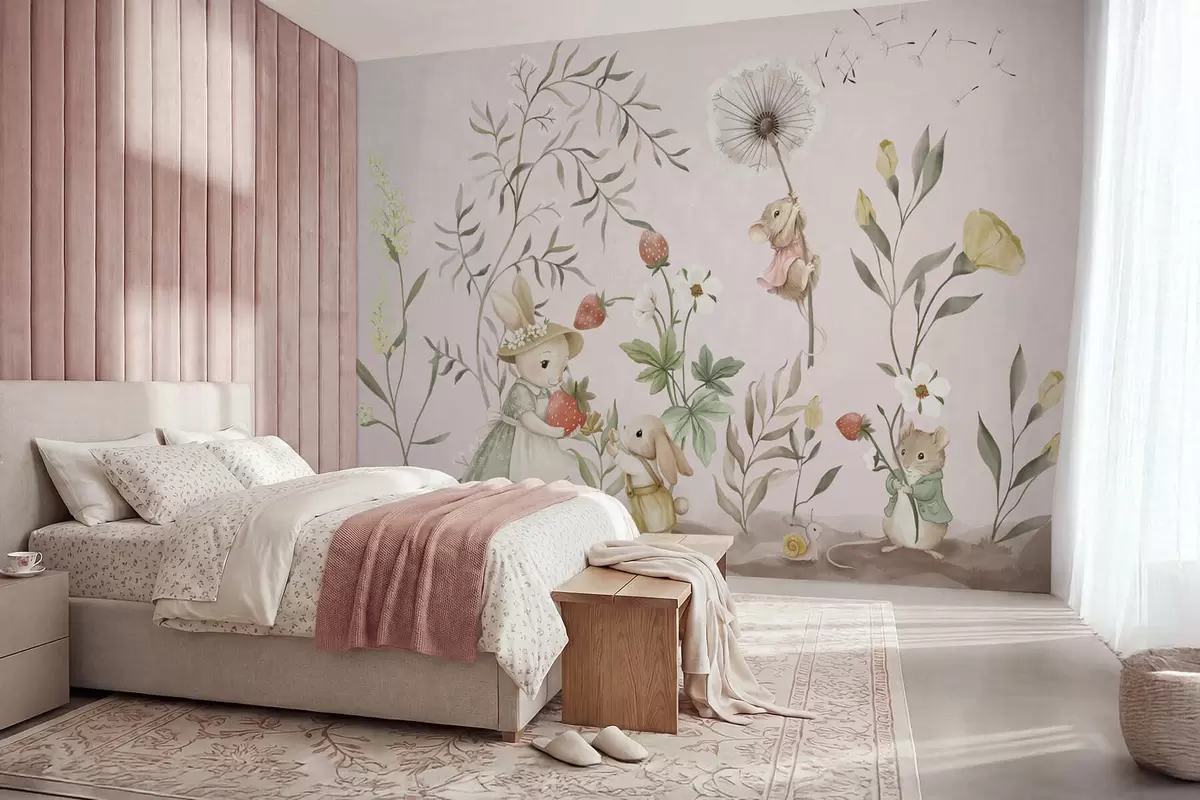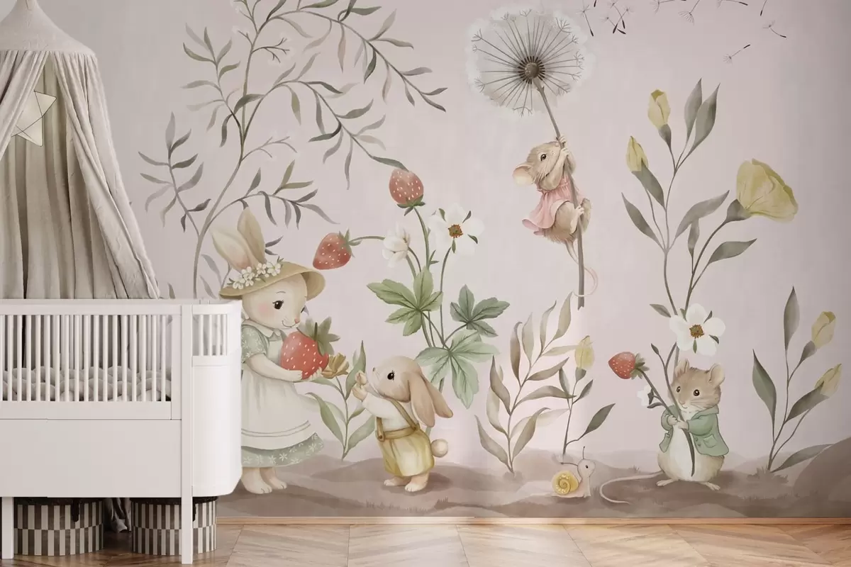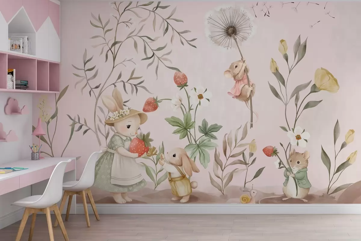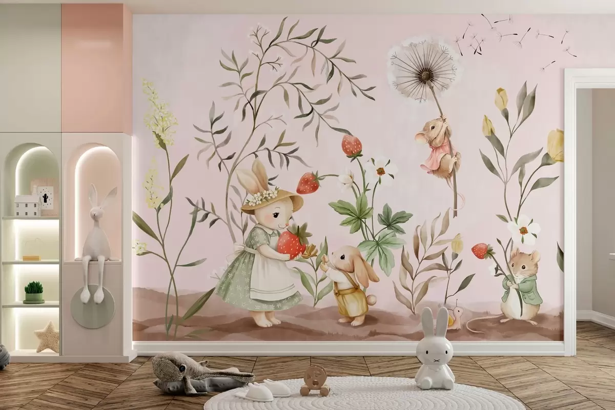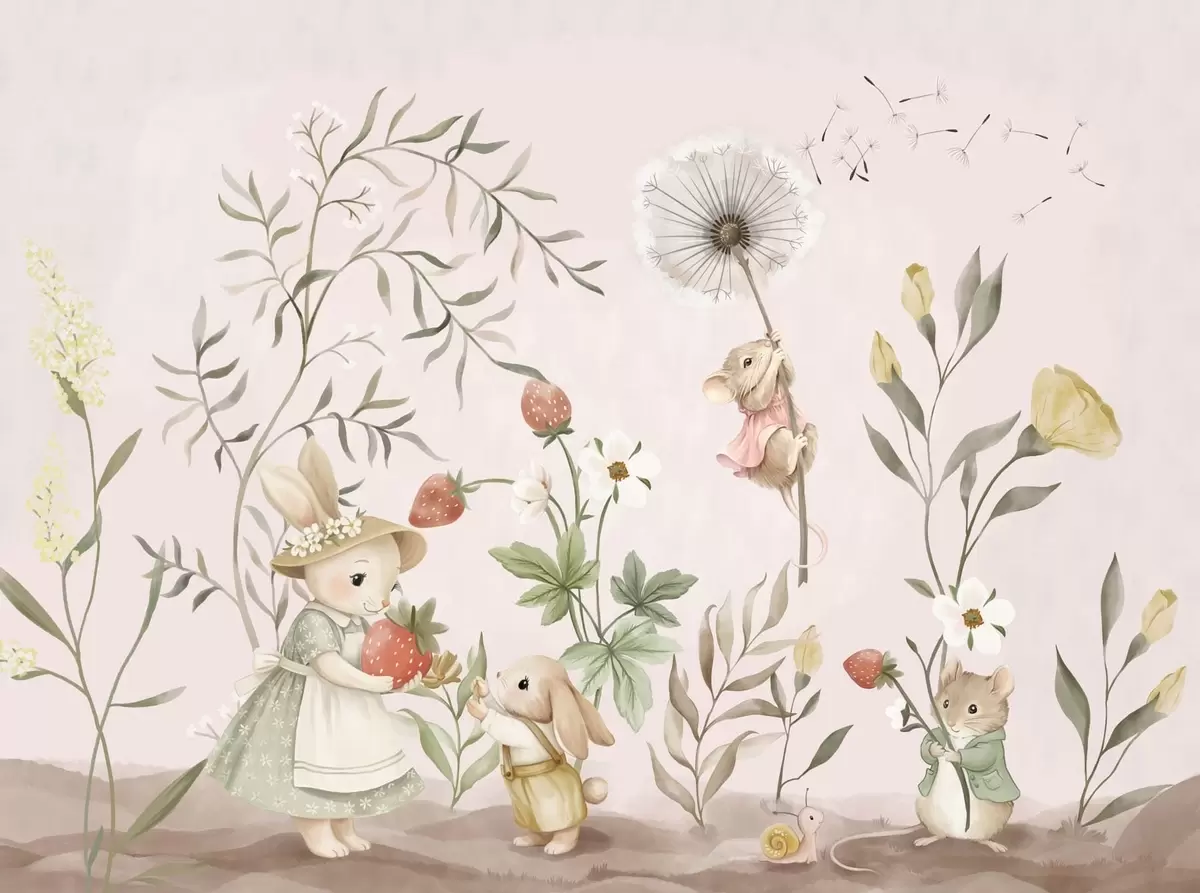 Fototapeta Ilustracja przedstawiająca zwierzęta z truskawkami na delikatnym różowym tle Nr w05422v1