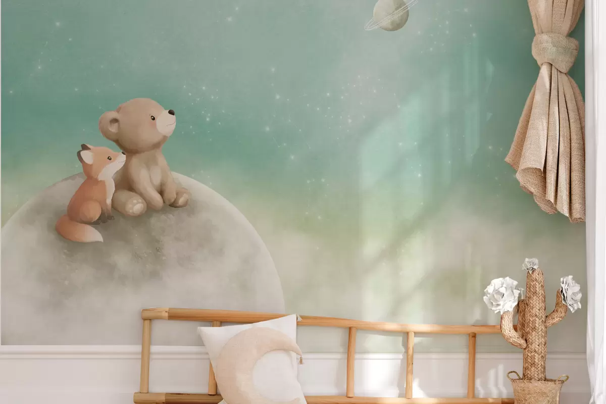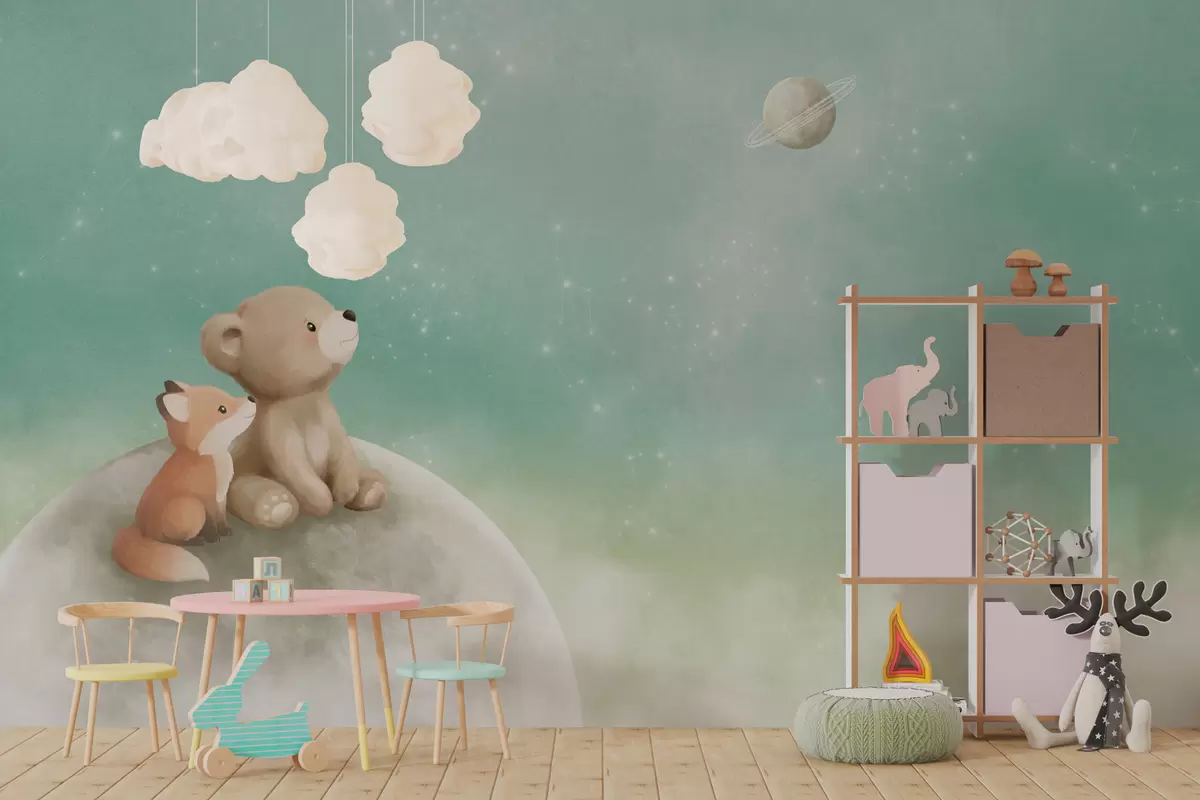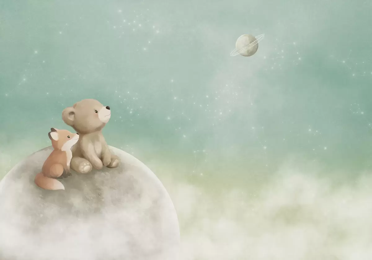 Fototapeta Pastelowa ilustracja przedstawiająca niedźwiadka i lisa na tle zielonego nieba Nr w05431v1