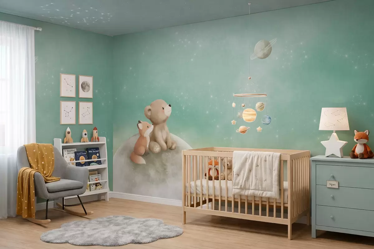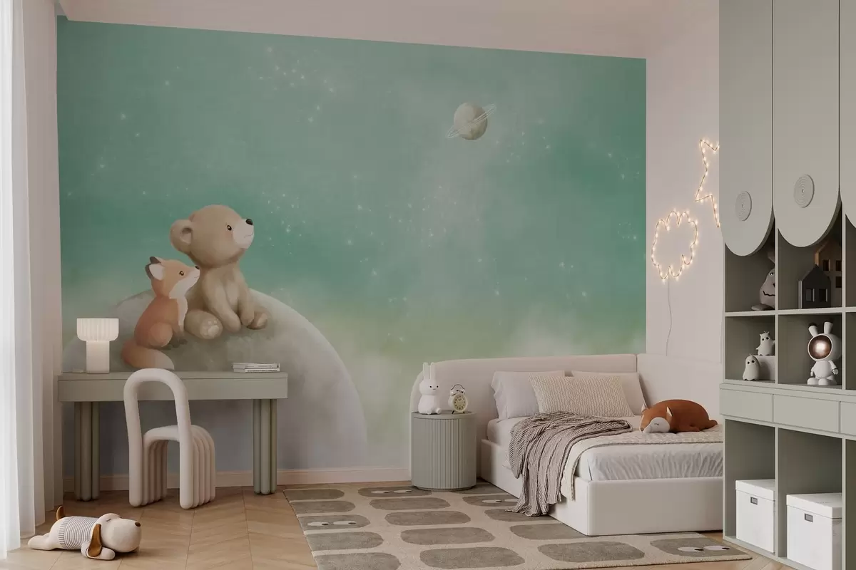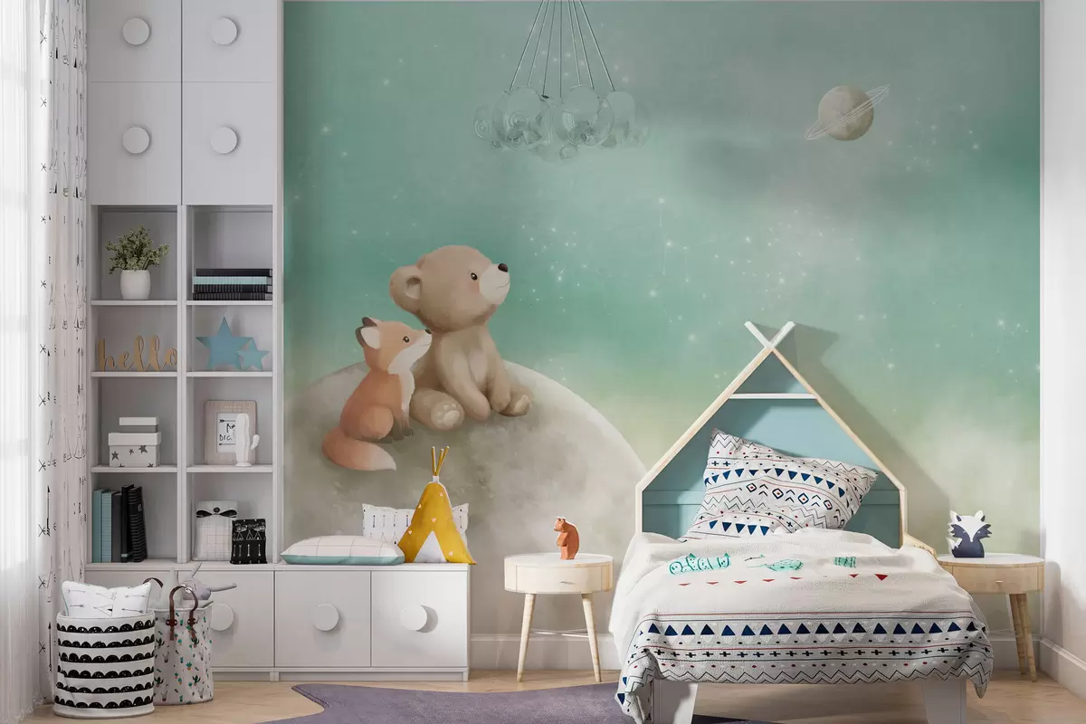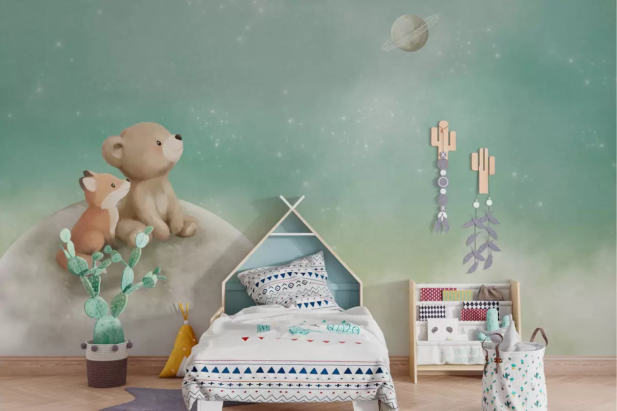 Fototapeta Pastelowa ilustracja przedstawiająca niedźwiadka i lisa na tle zielonego nieba Nr w05431v1