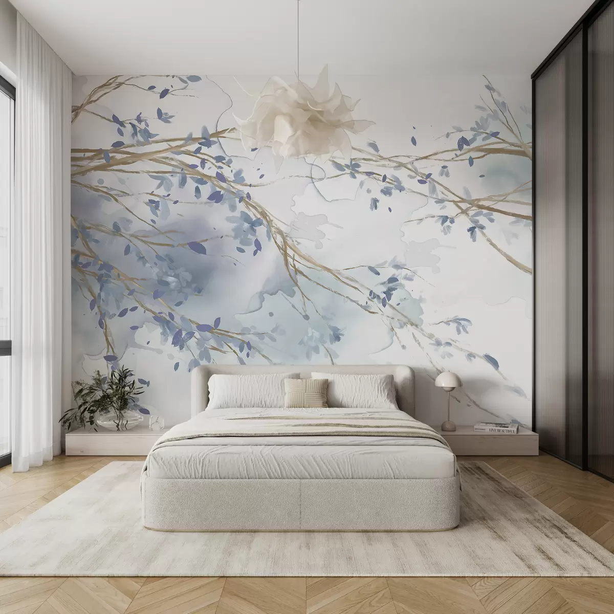 Fototapeta Delikatne niebiesko-białe kwiatowe gałązki z miękkim, rozmytym akwarelowym tłem Nr w07919