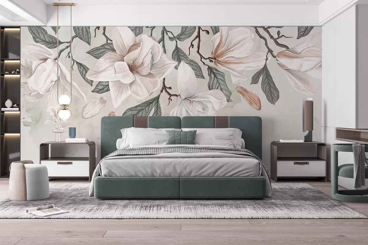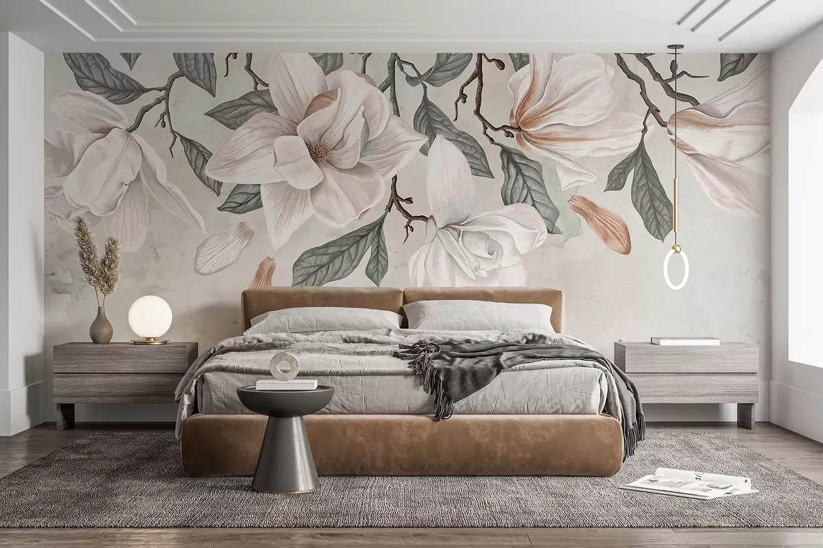 Fototapeta Delikatne różowe i białe kwiaty magnolii z zielonymi liśćmi na jasnym tle, delikatna, kwiatowa kompozycja Nr w07977