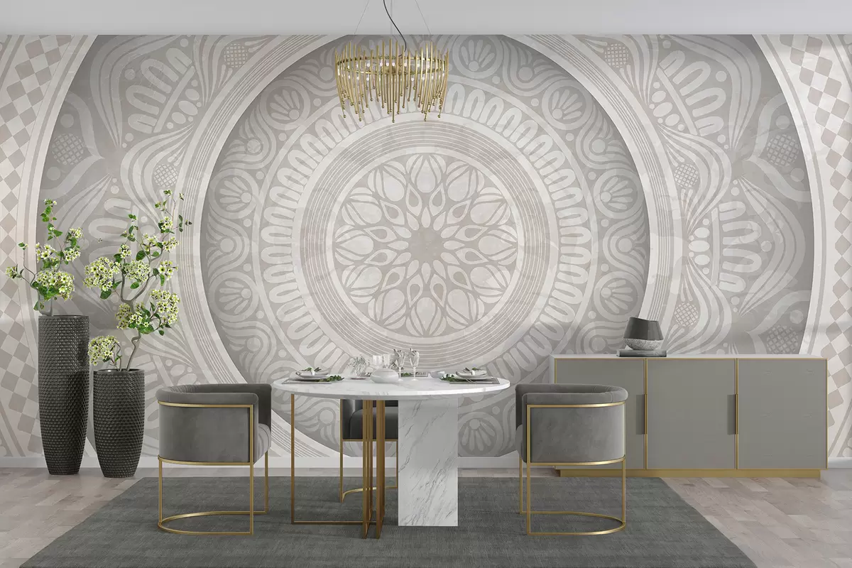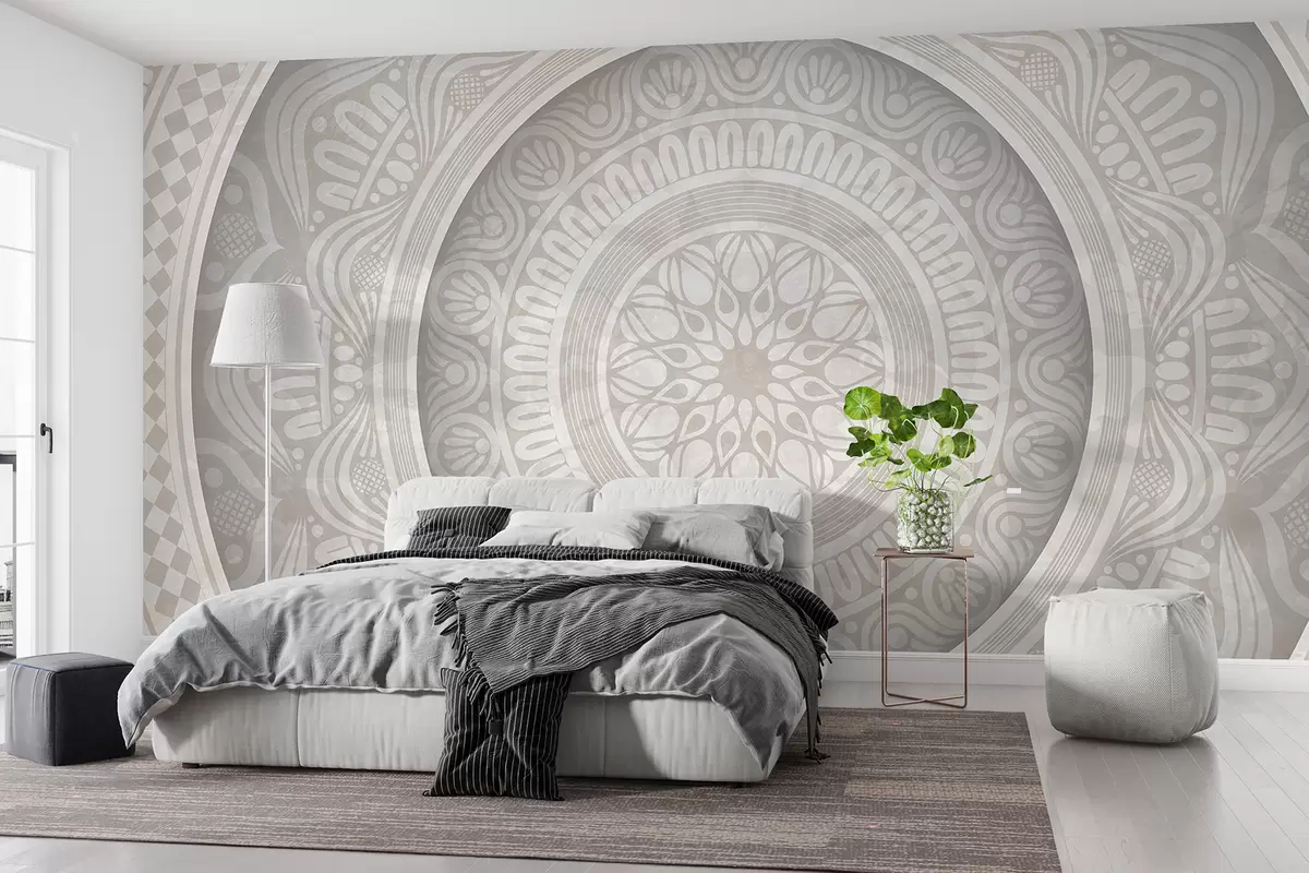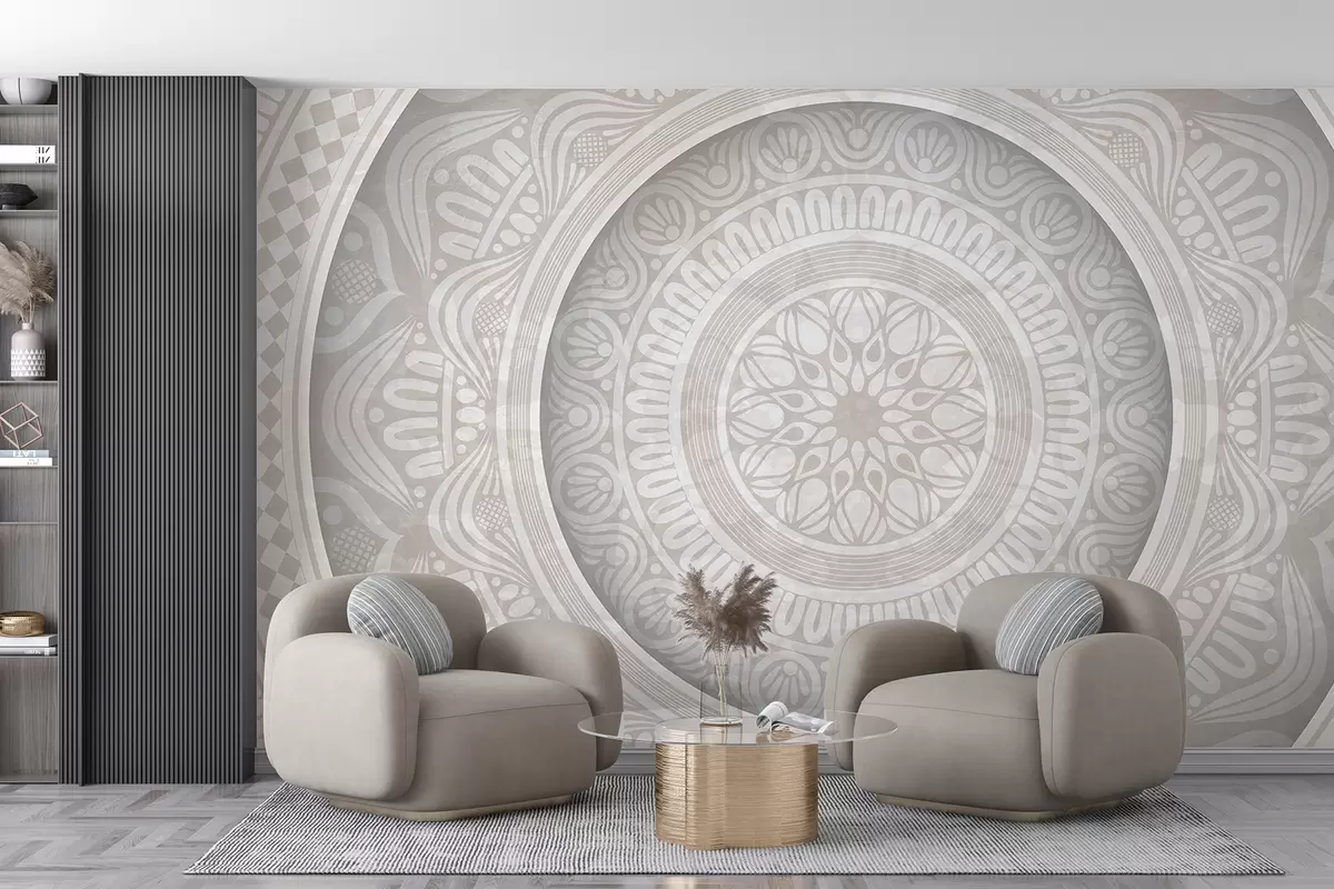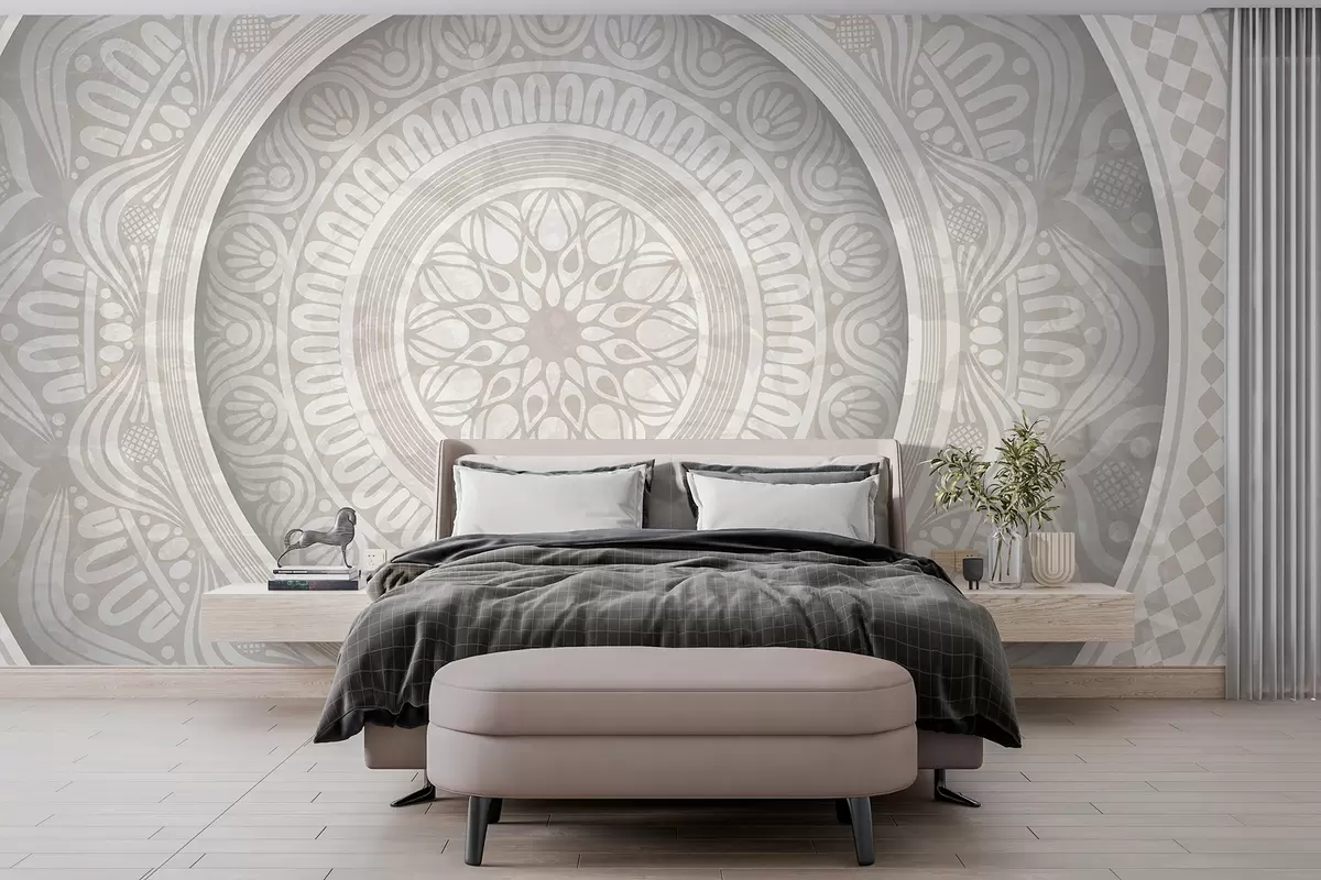 Fototapeta Szczegółowy, symetryczny, szaro-biały nadruk mandali z koncentrycznymi okręgami i geometrycznymi kształtami Nr w08182