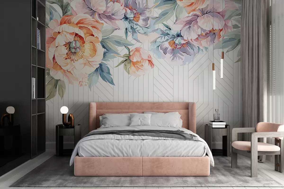 Fototapeta Żywe, brzoskwiniowe i różowe abstrakcyjne piwonie z zielonymi liśćmi na białym i szarym tle wzoru Nr w08183