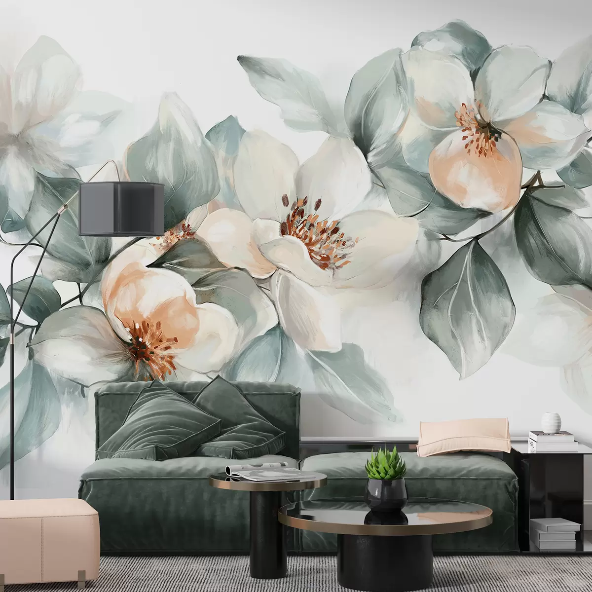 Fototapeta Delikatne białe i różowe kwiaty magnolii z miękkimi zielonymi liśćmi na jasnym tle Nr w08220