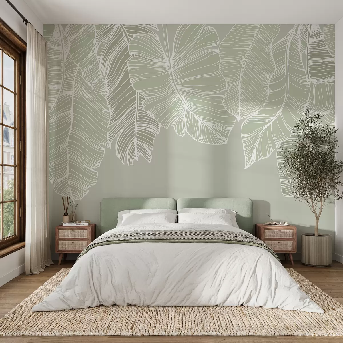Fototapeta Białe liście tropikalnych kwiatów na jasnozielonym tle, minimalistyczny design Nr w08235v1