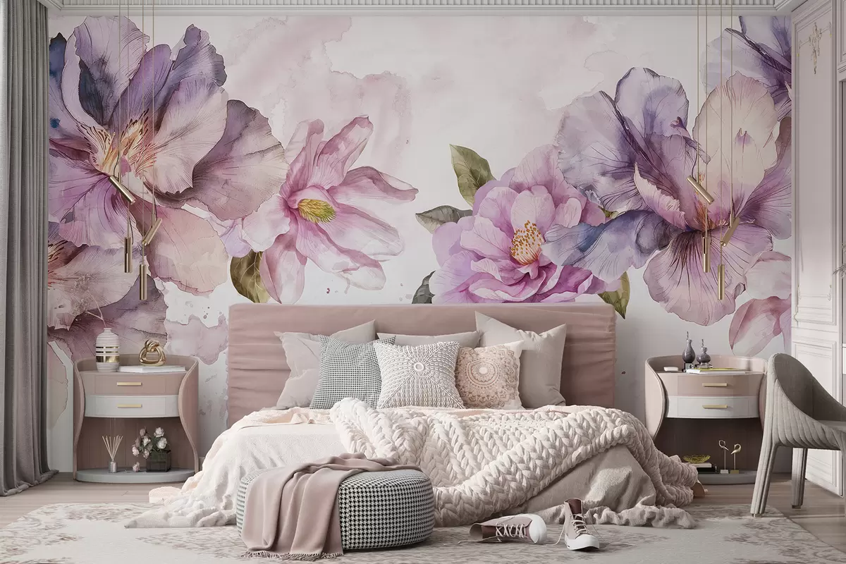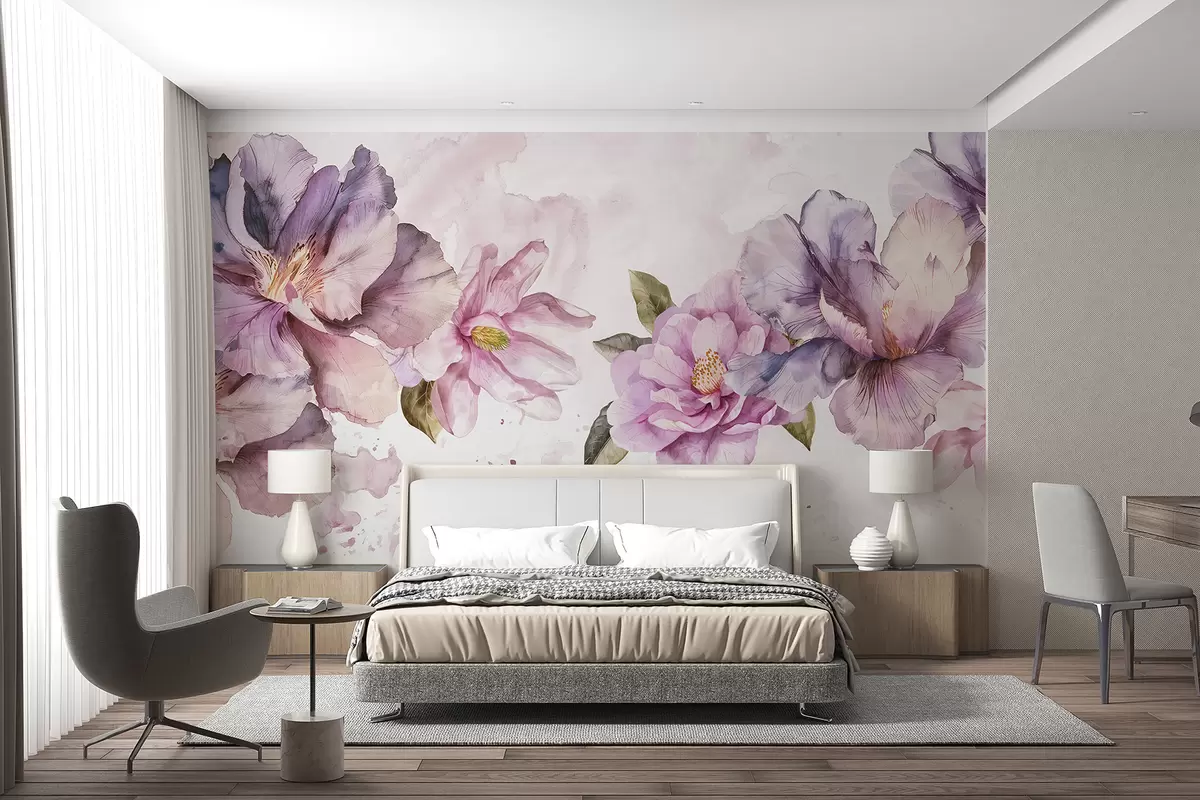 Fototapeta Delikatne różowe i fioletowe kwiaty akwarelowe z miękkimi płatkami i zielonymi liśćmi na jasnym tle Nr w08238