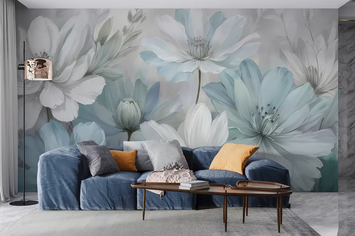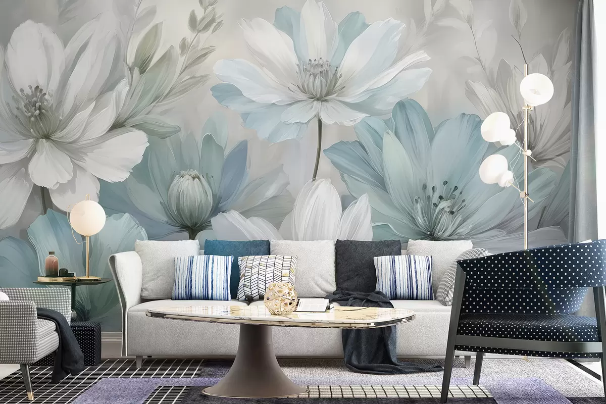 Fototapeta Zbliżenie białych i jasnoniebieskich kwiatów przypominających stokrotki, tworzących dzieło sztuki na miękkim, rozmytym tle Nr w08247