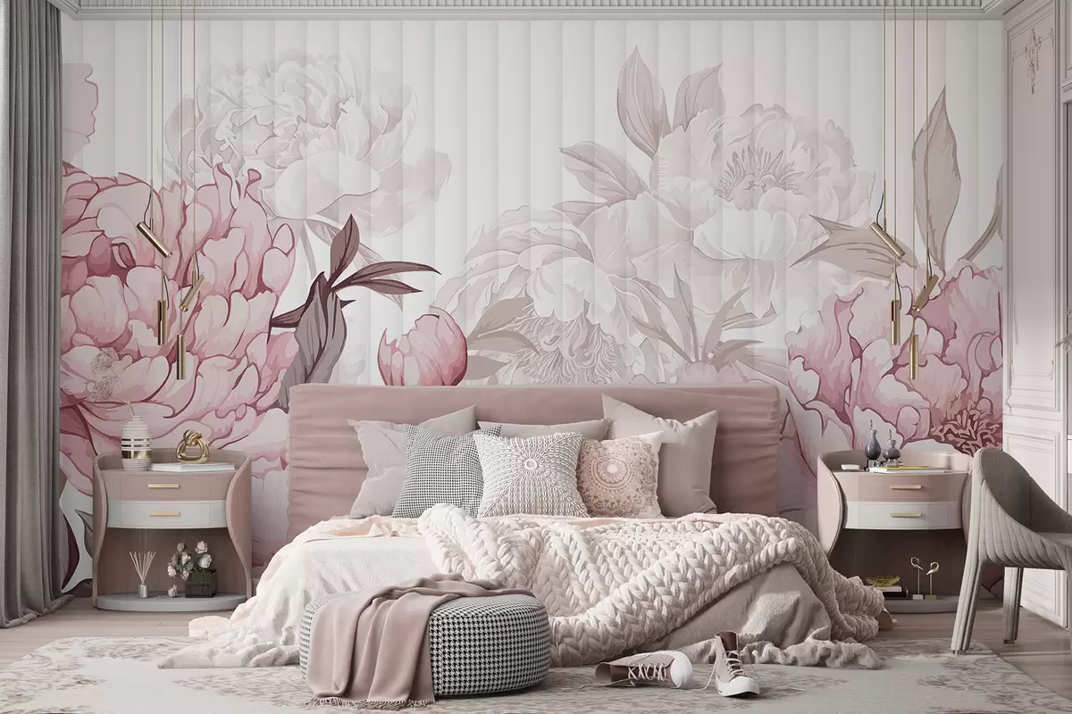 Fototapeta Zbliżenie dużych, delikatnych różowych i białych kwiatów piwonii na miękkim, teksturowanym tle Nr w08255