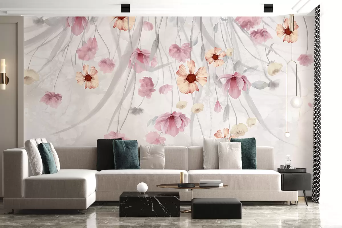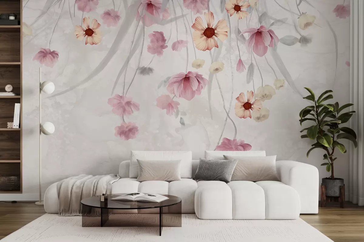 Fototapeta Delikatne pastelowe różowe i żółte kwiaty z żółtymi środkami spływają kaskadami po miękkim, rozmytym tle Nr w08261v1
