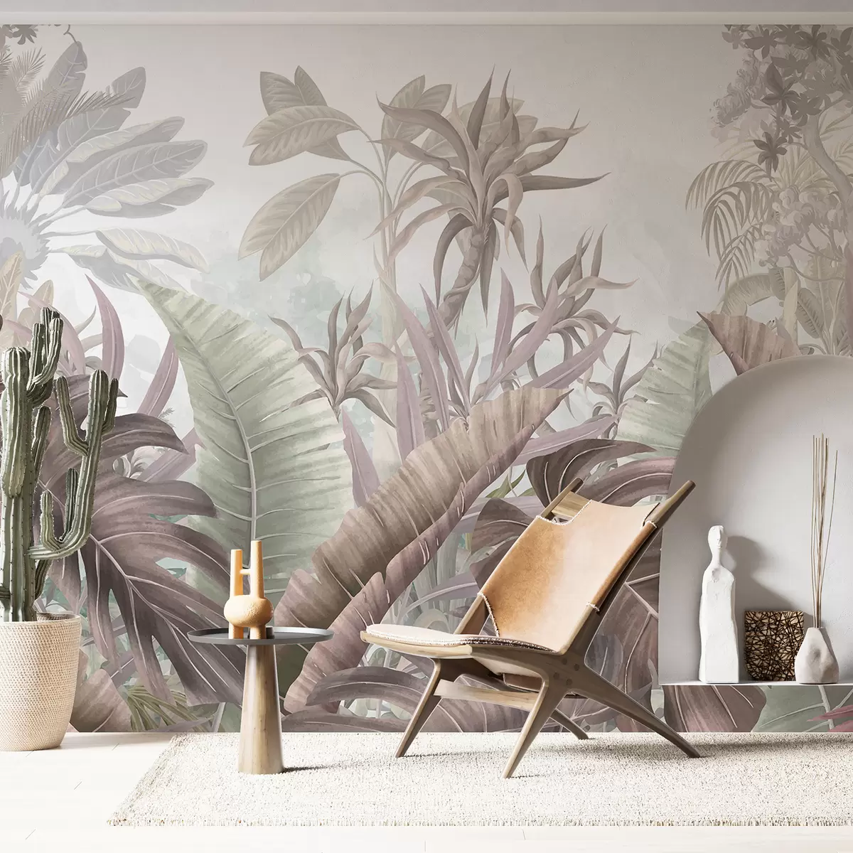 Fototapeta Tropikalna dżungla z dużymi liśćmi palm i egzotycznymi roślinami w odcieniach szarości, bieli i beżu Nr w08307
