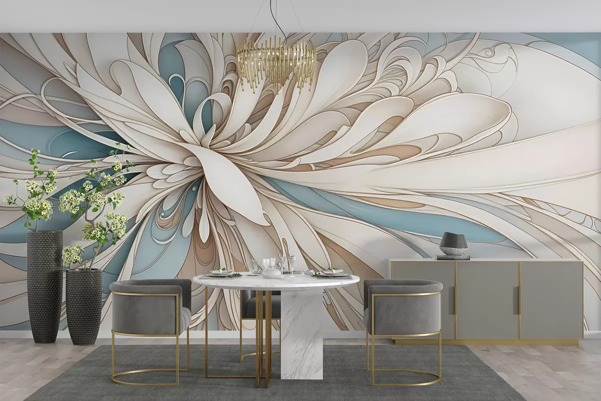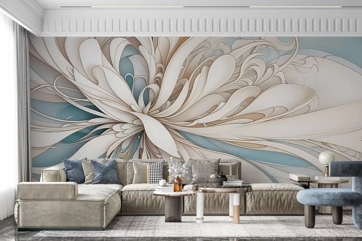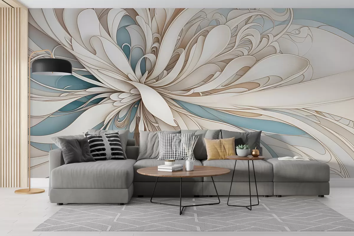 Fototapeta Abstrakcyjny kwiatowy wzór z wirującymi, organicznymi kształtami w odcieniach beżu, opalenizny i niebieskiego z jasnym tłem Nr w08311