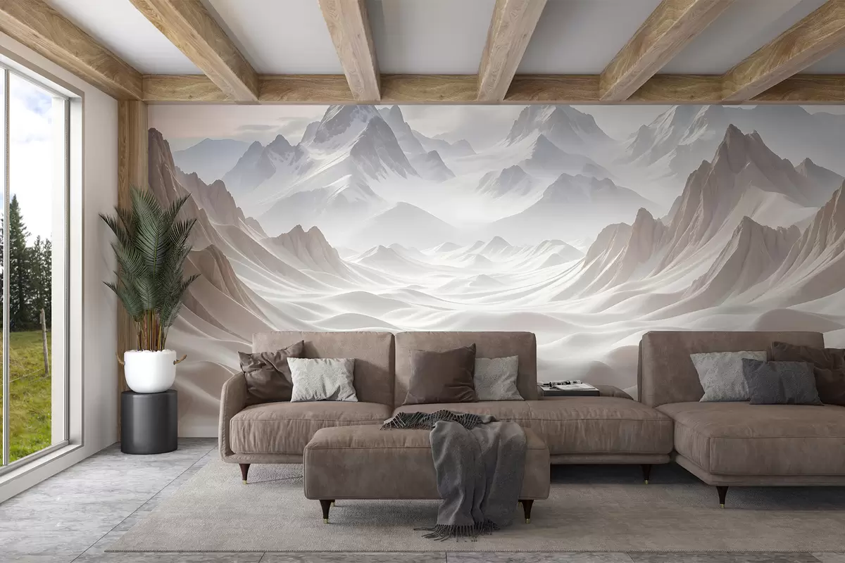 Fototapeta Ośnieżone szczyty górskie wyłaniające się z mglistego, eterycznego krajobrazu z falistymi wzgórzami i dolinami Nr w08313