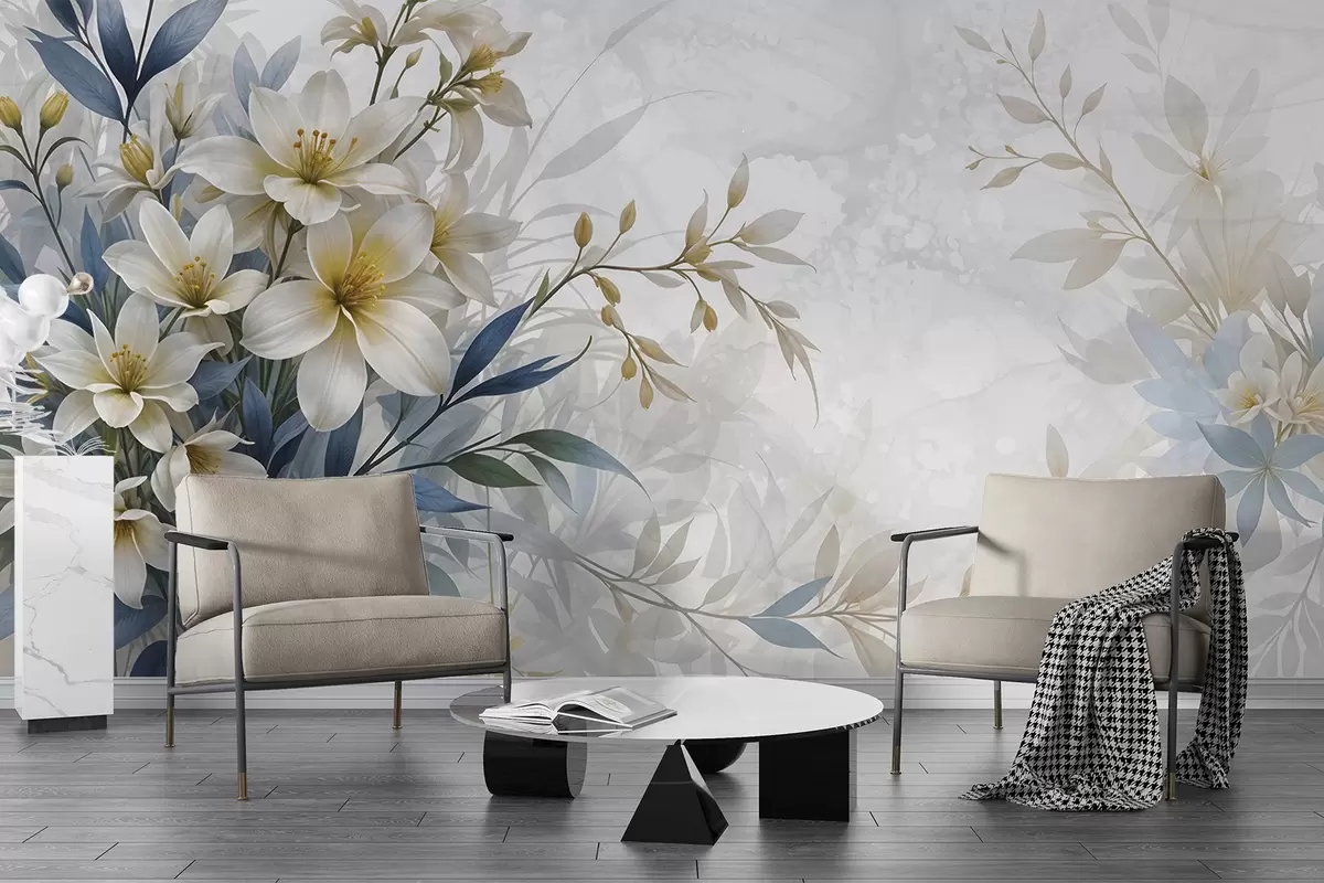 Fototapeta Biały, beżowy i niebieski bukiet kwiatów z delikatnymi liśćmi na miękkim, rozmytym tle Nr w08314