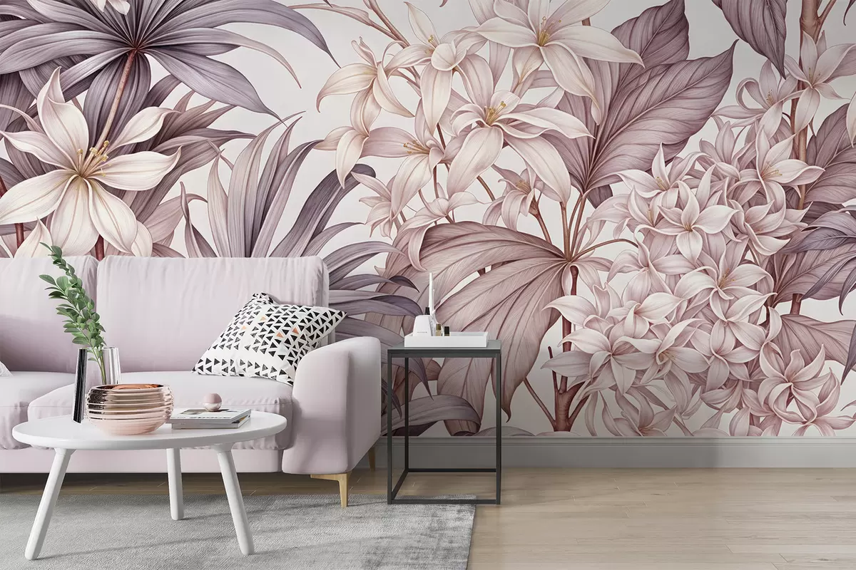 Fototapeta Tropikalny kwiatowy nadruk z dużymi białymi i jasnoróżowymi kwiatami, liśćmi bordo i neutralnym tłem Nr w08318v1