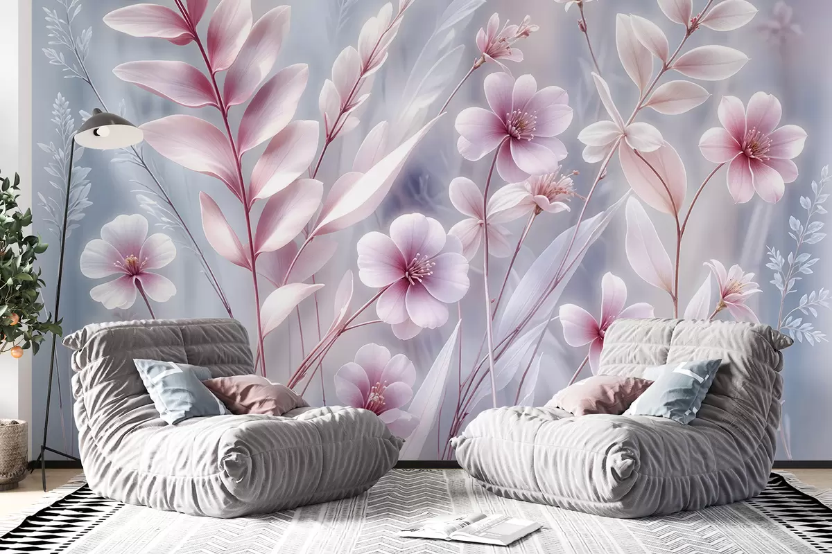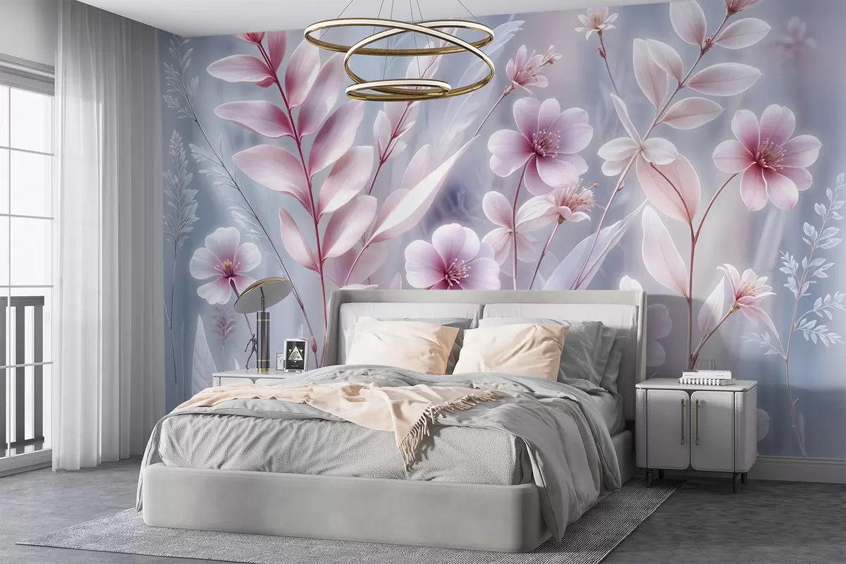 Fototapeta Delikatne różowe kwiaty i kwiaty z miękkimi płatkami i liśćmi na jasnoszarym abstrakcyjnym tle Nr w08323