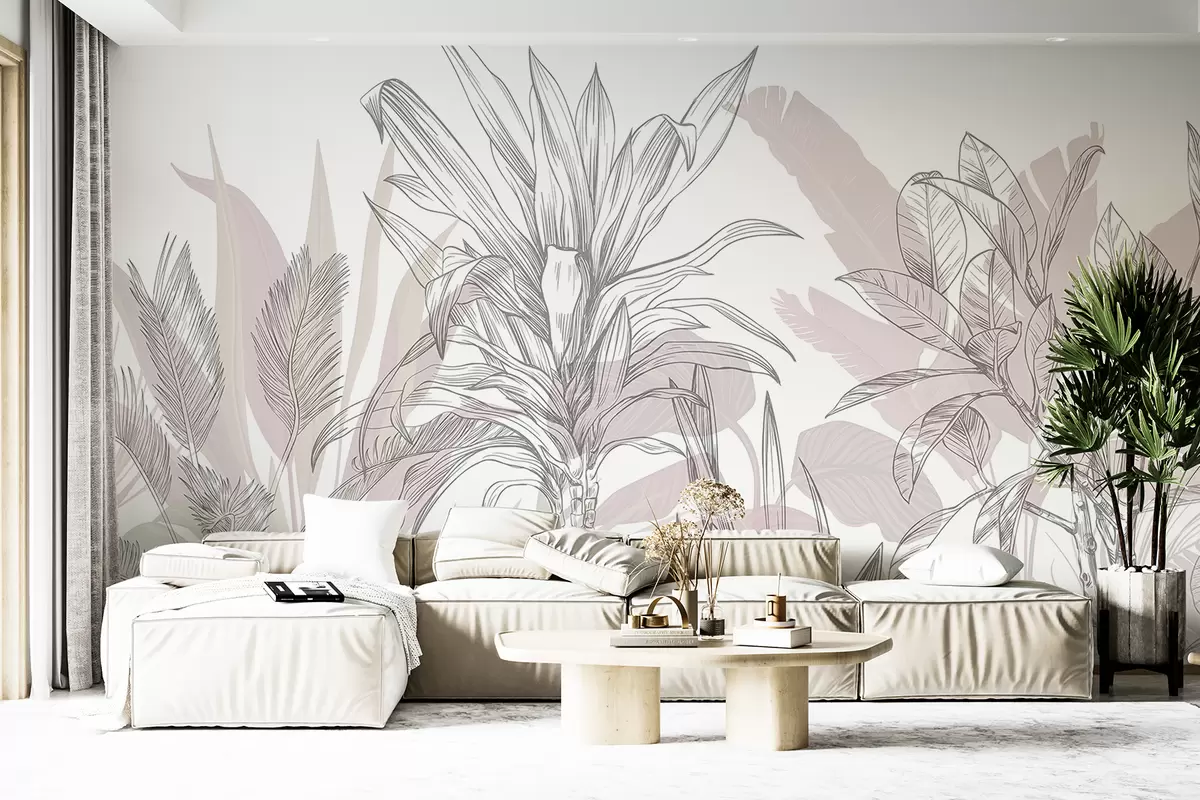 Fototapeta Tropikalna grafika roślin z dużymi, bujnymi liśćmi i kwiatami w odcieniach szarości i bieli z kwiatowymi różowymi sylwetkami Nr w08327v1