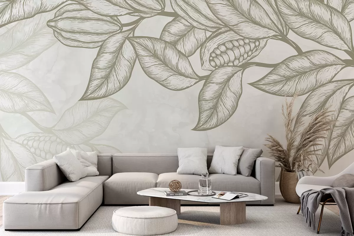 Fototapeta Szczegółowy rysunek liści kakaowca i liści w naturalnym, organicznym nadruku Nr w08334