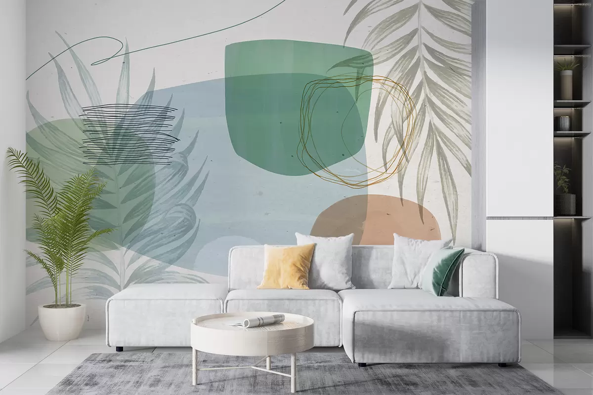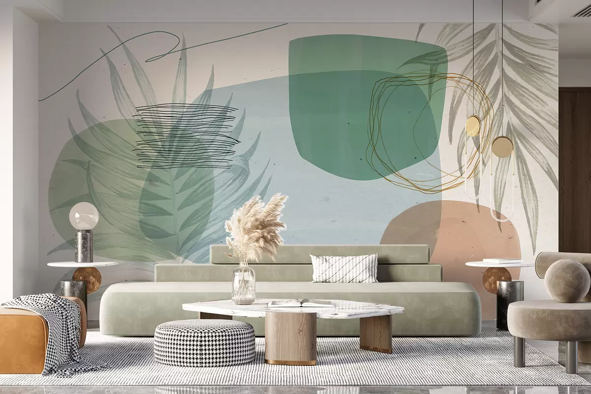 Fototapeta Abstrakcyjna teksturowana kompozycja z organicznymi kształtami i tropikalnymi liśćmi, w stonowanych pastelowych kolorach Nr w08335