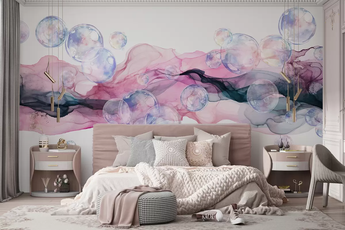 Fototapeta Kolorowe abstrakcyjne płynne kształty z bąbelkami, zawirowaniami w odcieniach różu, błękitu i fioletu na białym tle Nr w08337
