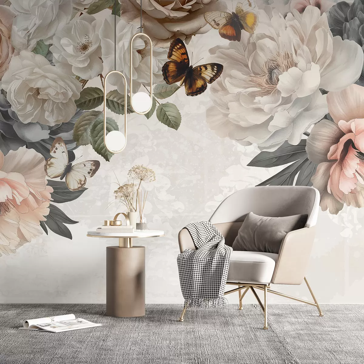 Fototapeta Duże białe i różowe kwiaty piwonii z motylem siedzącym na jednym z kwiatów na miękkim, rozmytym tle Nr w08340