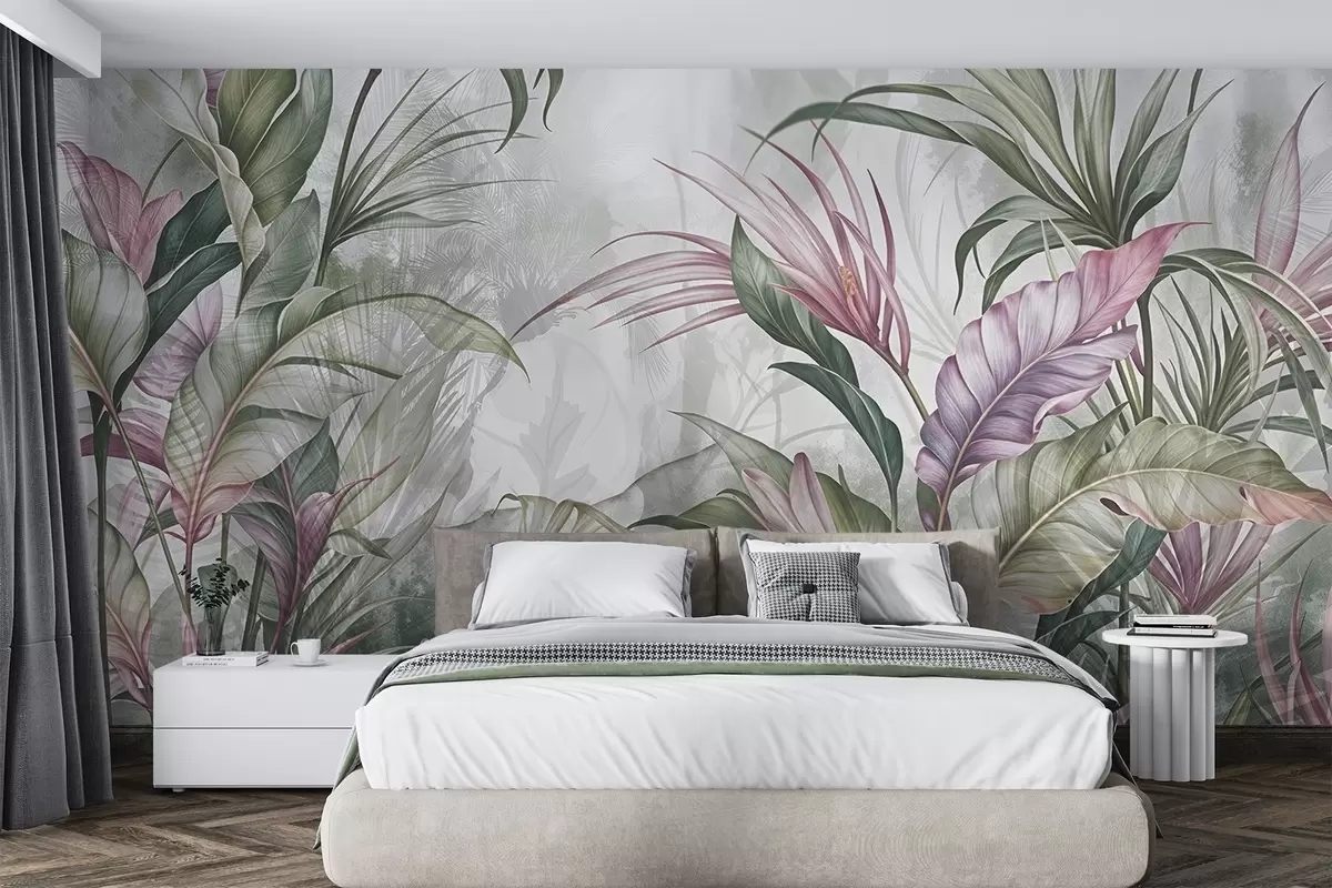 Fototapeta Tropikalna dżungla z dużymi zielonymi liśćmi i różowymi kwiatami protei z rozmytym teksturowanym tłem Nr w08375