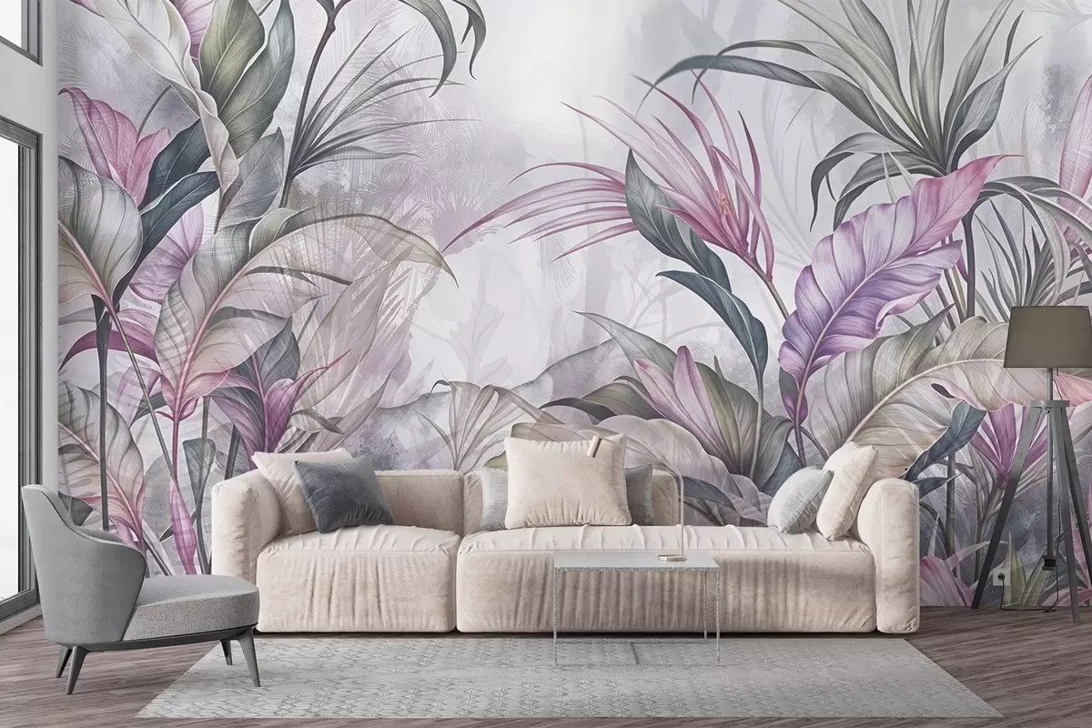 Fototapeta Tropikalna dżungla z dużymi zielonymi liśćmi i różowymi kwiatami protei z rozmytym teksturowanym tłem Nr w08375v1