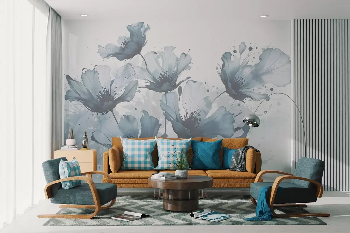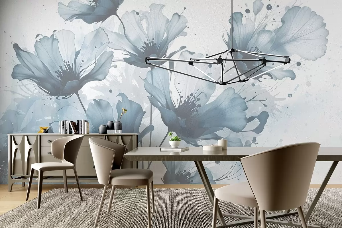 Fototapeta Delikatne niebieskie kwiaty z miękkimi, rozmytymi płatkami i akwarelami na jasnym tle Nr w08376