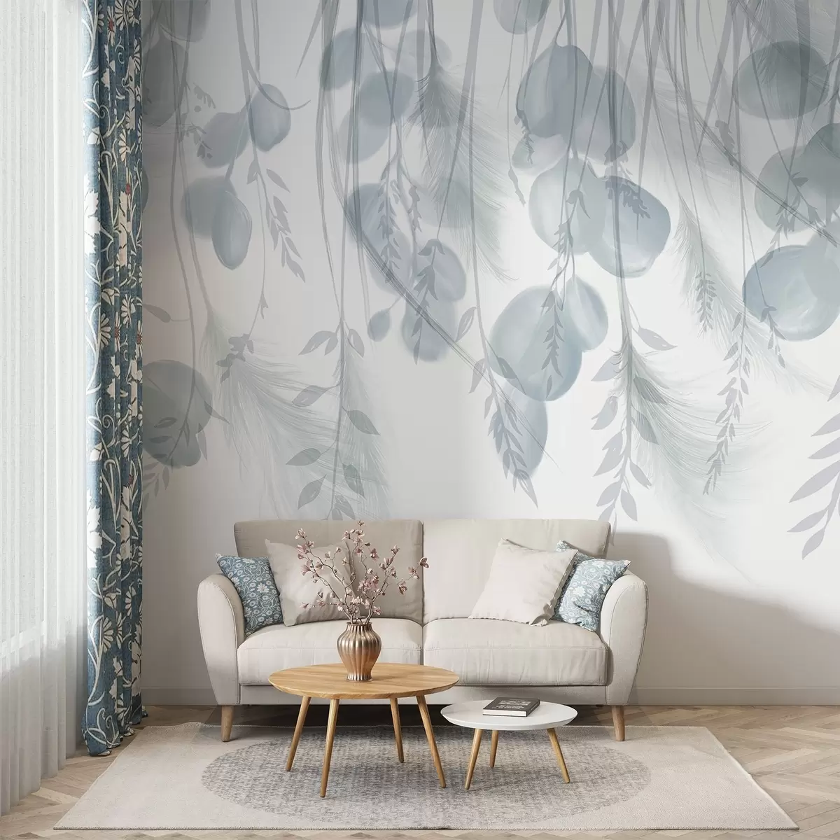 Fototapeta Delikatne szare i pastelowe zielone liście eukaliptusa opadają, tworząc pogodną i uspokajającą atmosferę Nr w08380