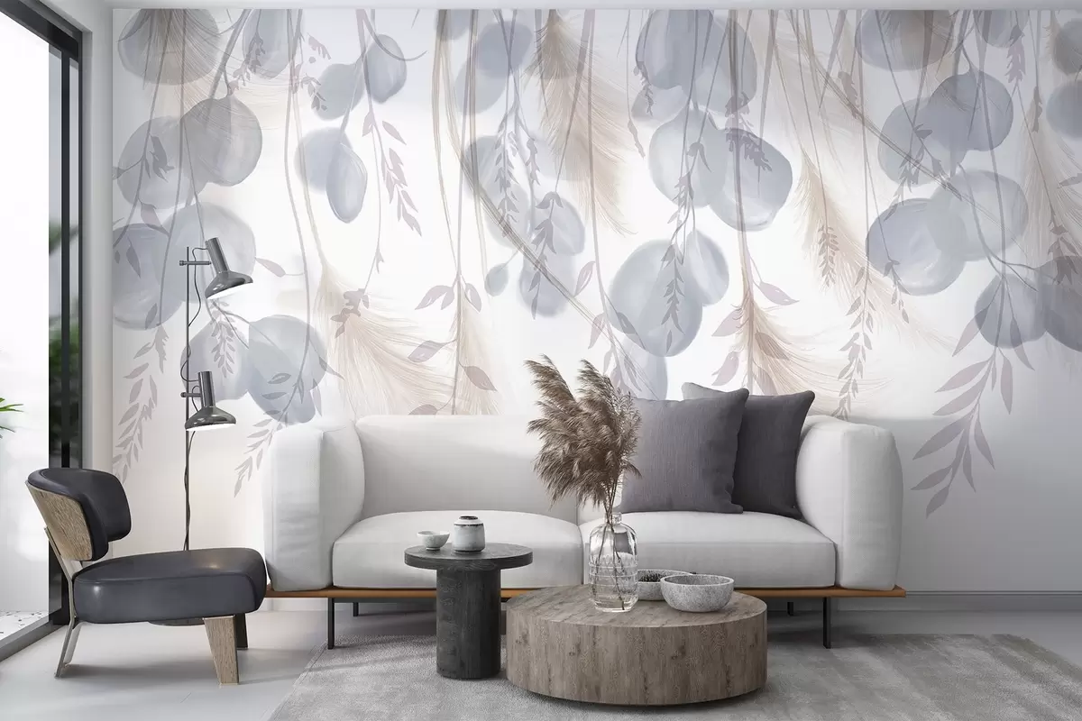 Fototapeta Delikatne niebieskie i pastelowe beżowe liście eukaliptusa opadają, tworząc pogodną i uspokajającą atmosferę Nr w08380v1