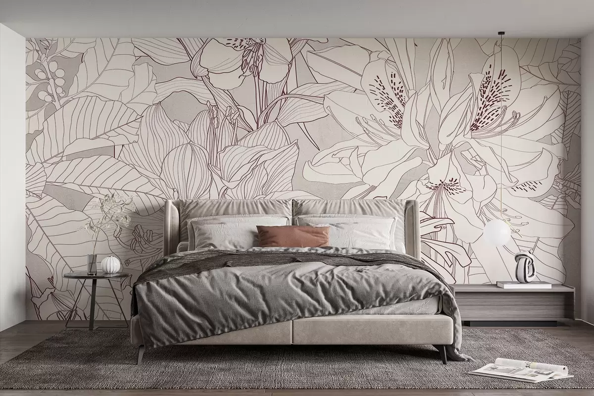 Fototapeta Szczegółowy bordowo-szary kwiatowy nadruk z różnymi rodzajami kwiatów i liści, bujny, skomplikowany botaniczny wzór Nr w08385