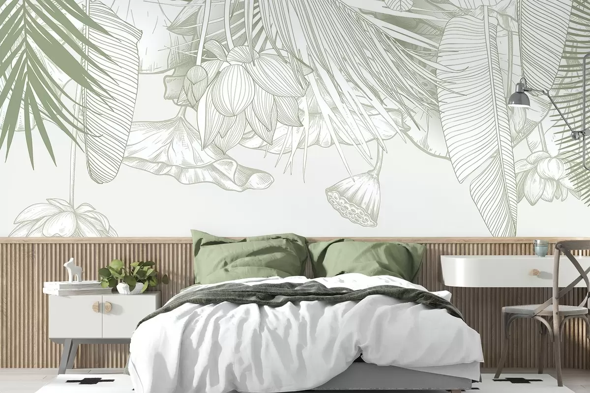 Fototapeta Zbliżenie na zielony kwiatowy nadruk z dużymi, zachodzącymi na siebie płatkami i liśćmi w monochromatycznym kolorze Nr w08389v1