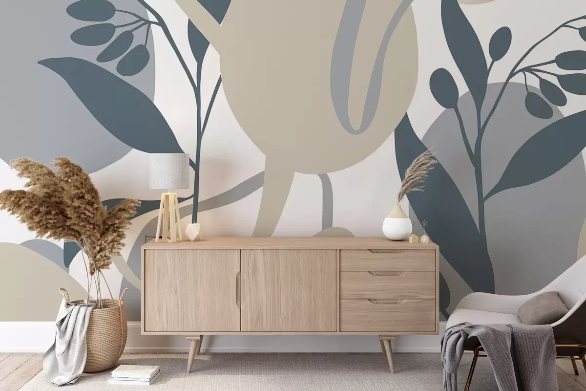 Fototapeta Minimalistyczny abstrakcyjny kwiatowy nadruk z beżowymi i szarymi kształtami na białym tle Nr w08400