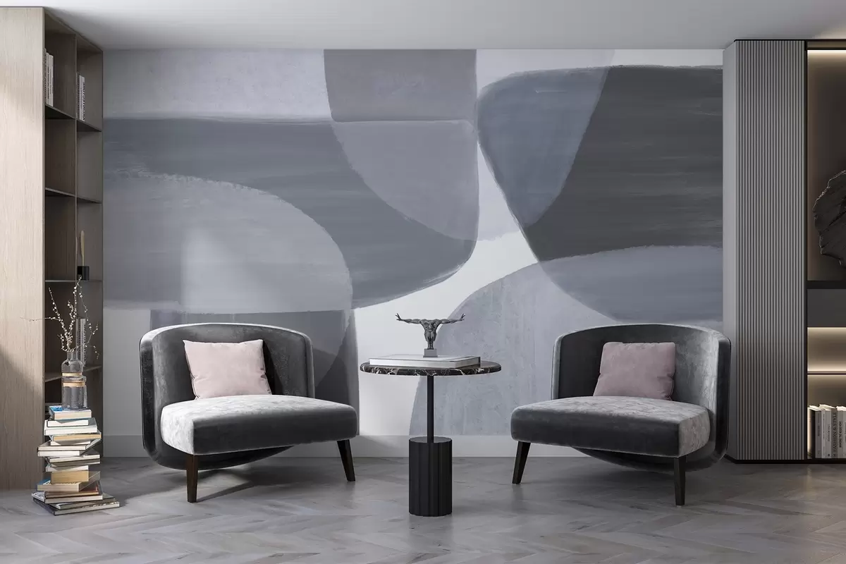 Fototapeta Monochromatyczny abstrakcyjny nadruk z nakładającymi się minimalistycznymi kształtami i formami w odcieniach szarości i błękitu Nr w08410