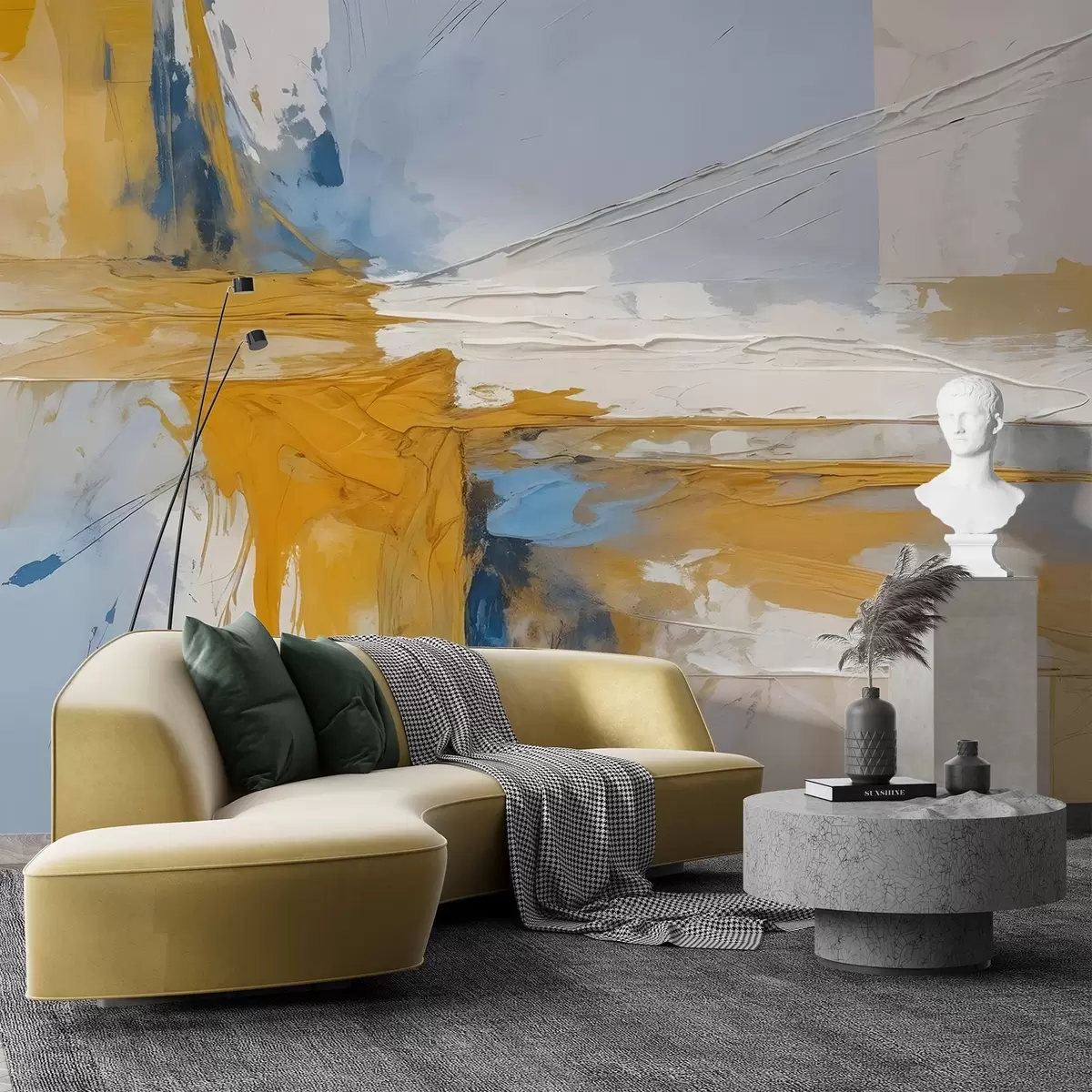 Fototapeta Minimalistyczna kompozycja abstrakcyjna z odważnymi pociągnięciami pędzla w kolorze żółtym, niebieskim i białym Nr w08414