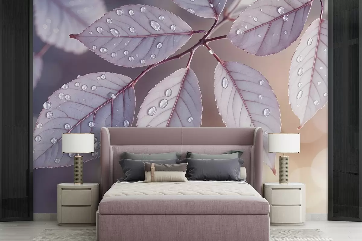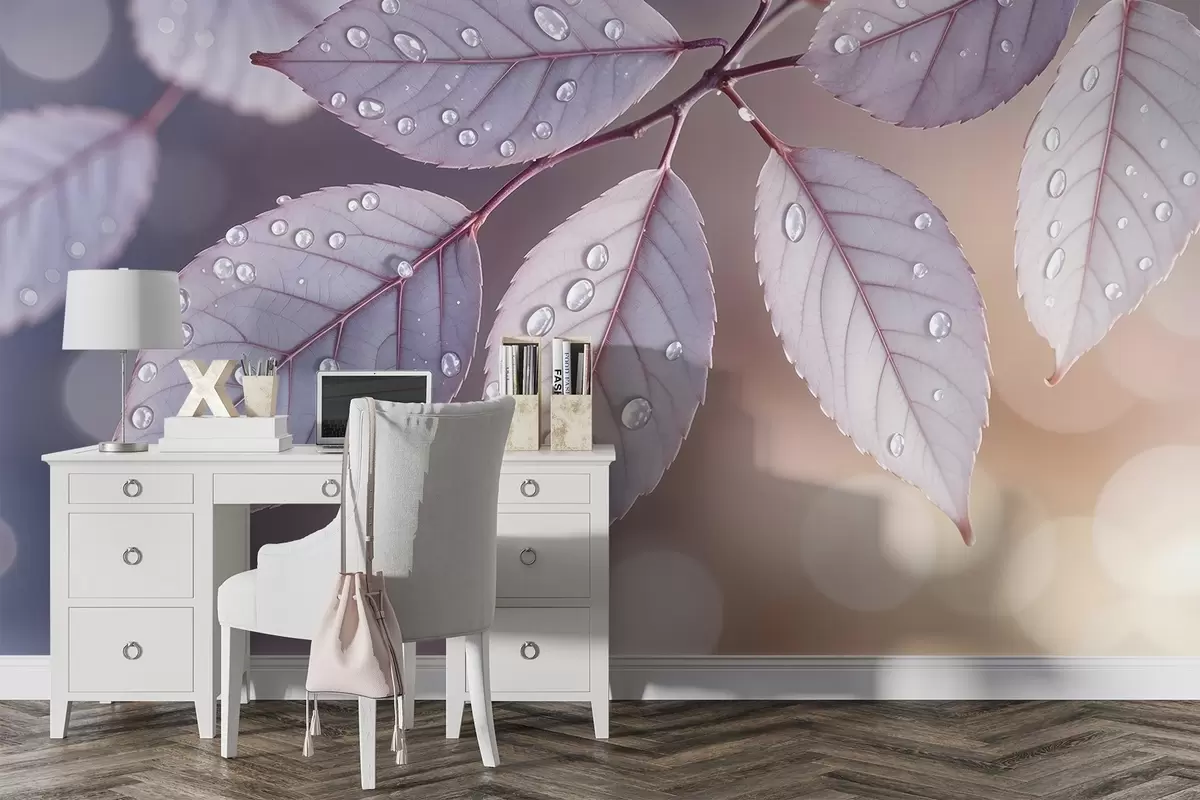 Fototapeta Delikatne fioletowe liście z kroplami wody, miękkie tło ostrości Nr w08419