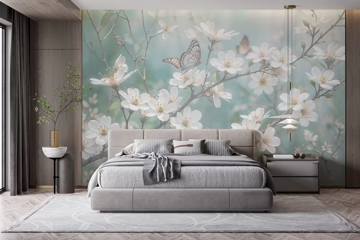 Fototapeta Biały motyl na gałęzi z delikatnymi białymi kwiatami wiśni na pierwszym planie na rozmytym tle Nr w08421