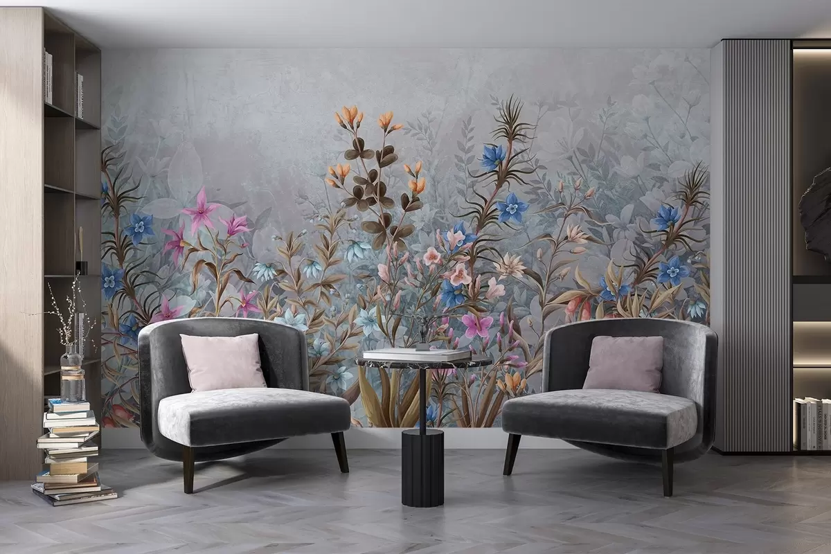 Fototapeta Bujny, żywy kwiatowy nadruk teksturowy z kolorowymi kwiatami i roślinami o skomplikowanych szczegółach i fakturach Nr w08428