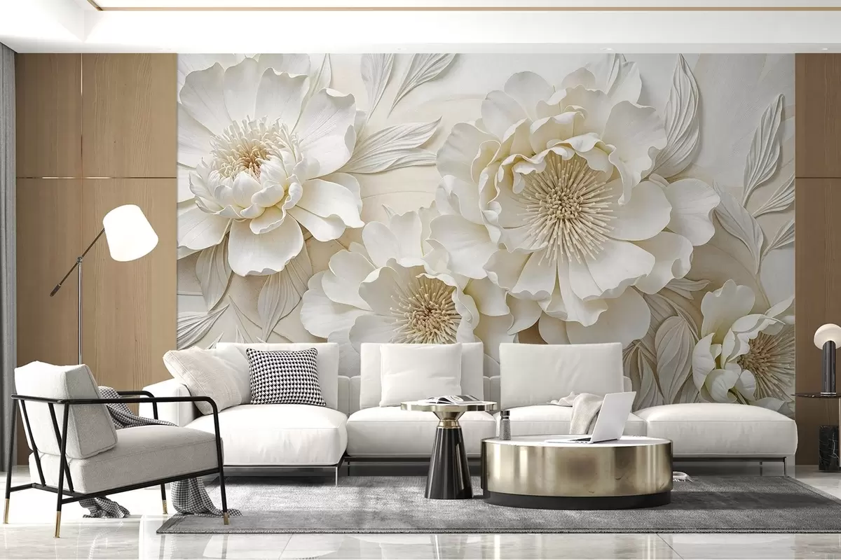 Fototapeta Elegancka, obszerna imitacja białych kwiatów piwonii z delikatnymi płatkami i pastelowymi żółtymi środkami, na jasnym tle Nr w08431