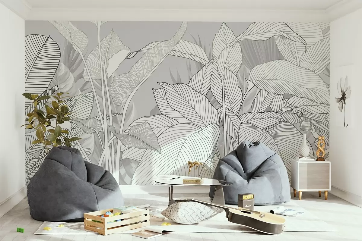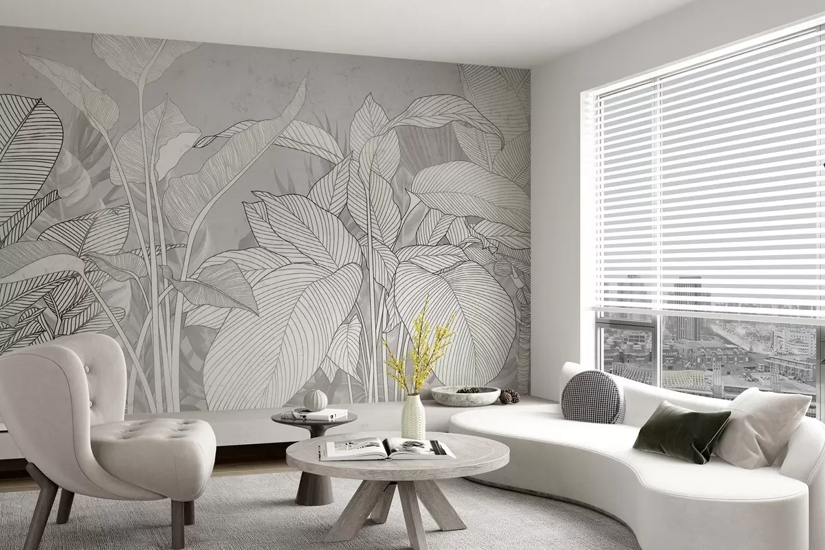 Fototapeta Monochromatyczna ilustracja przedstawiająca duże, stylizowane liście i listowie ze skomplikowanymi wzorami linii i teksturami Nr w08436