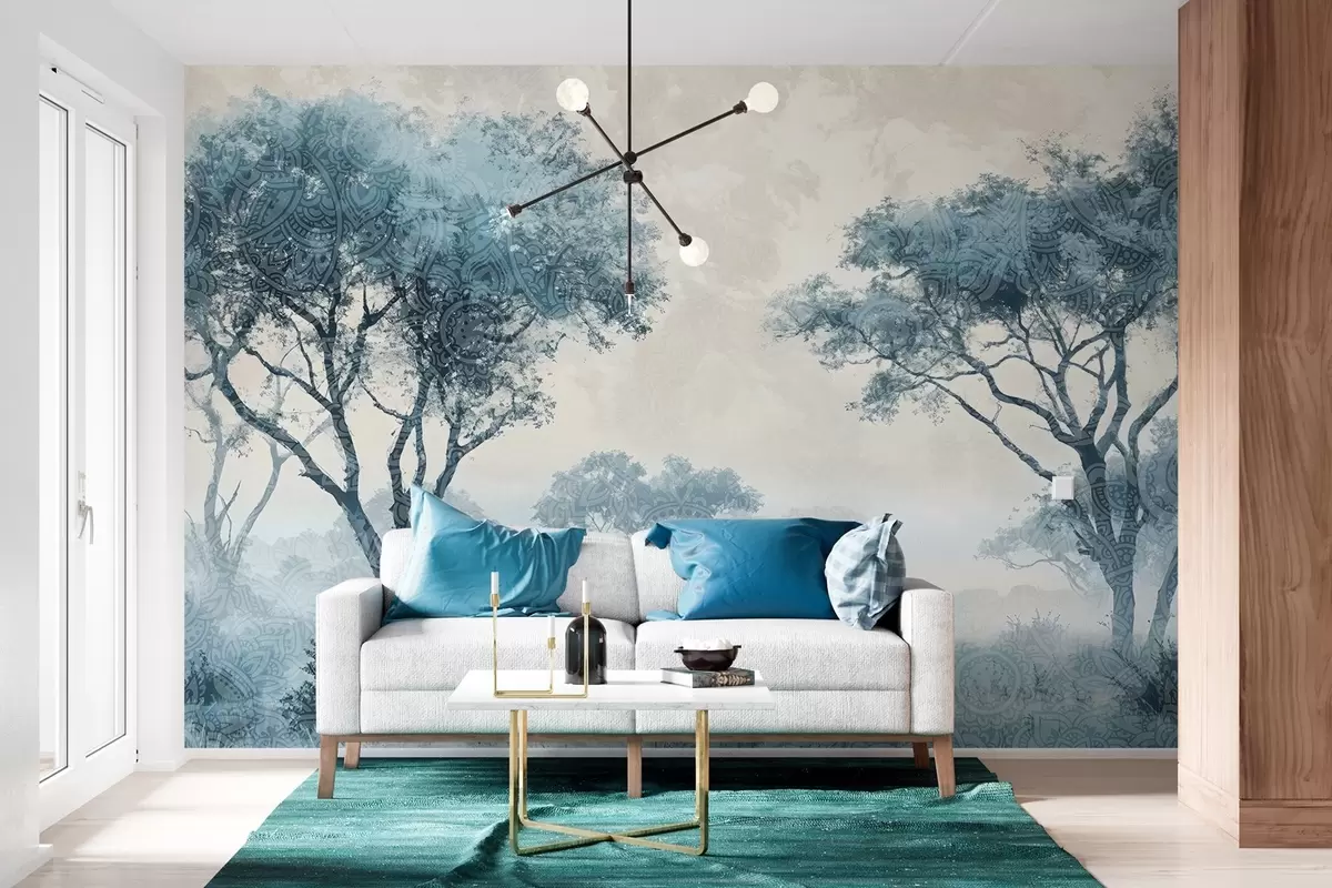 Fototapeta Mglisty, spokojny krajobraz z sylwetkami drzew na pierwszym planie i delikatną mgłą w odcieniach błękitu i beżu Nr w08442