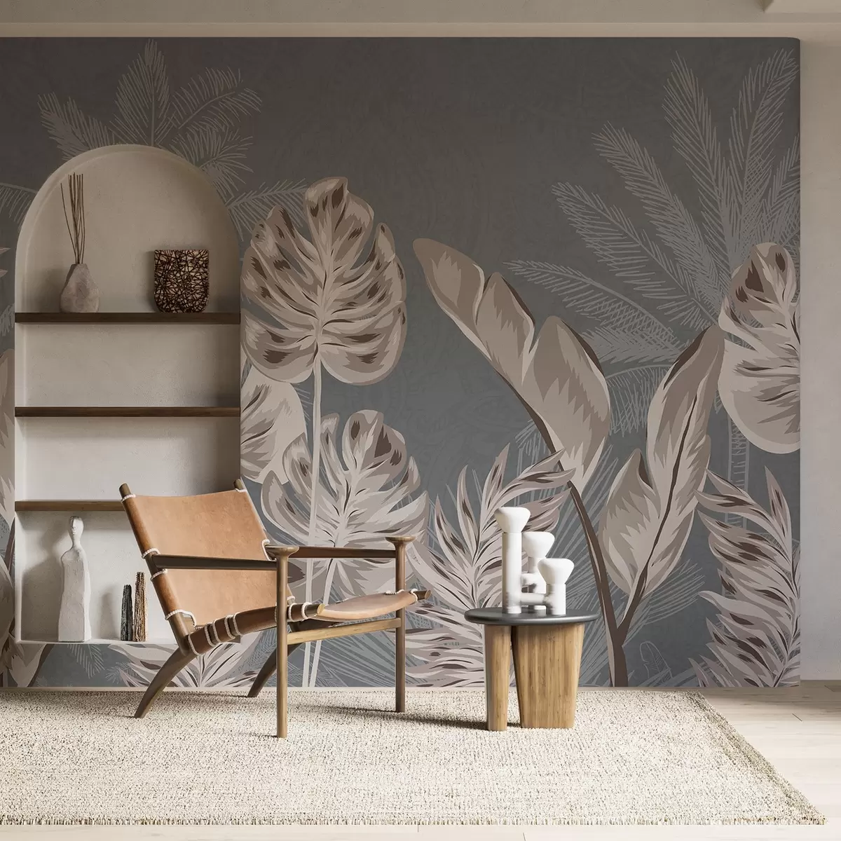 Fototapeta Duże, delikatne beżowe liście na stonowanym szarym tle, tworzące pogodną i eteryczną atmosferę Nr w08449